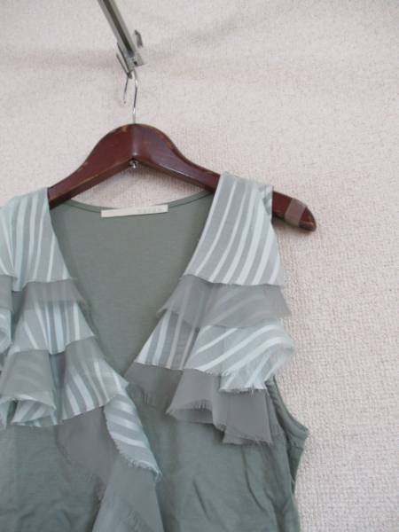 | 商品紹介 | 肩から前中央にかけてフリルが付いたオシャレなノースリーブです。 本体はくすんだグリーンです。 フリル部分は無地のシフォンとシフォンとサテンのストライプ生地が使われています。 フリル部分の端は切りっ放しです。 《素材》 表地:レーヨン70% ナイロン30% 別地/付属等:ポリエステル100% |