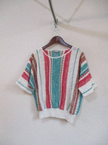 商品紹介 | 古着屋さんで購入しました。 カラフルなボーダーがカワイイドルマンニットです。 5分袖でゆったりしていますが、裾はリブになっているので だらしなくならずに着られます。 基本はクリームがかった白(キナリ)で、他にピンク、エメラルドグリーン、 茶などが使われています。 《素材》 文字が薄くなっていて判読不能 |