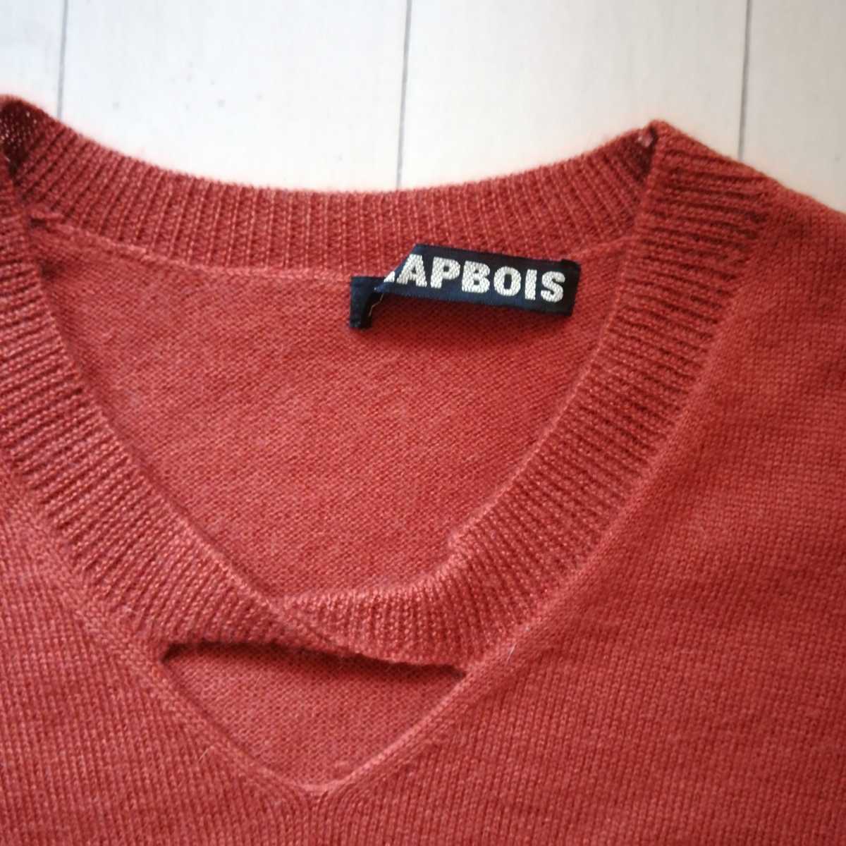 首もとのブランドタグはもともと、中心でなく右寄りになっています。(画像参照ください)