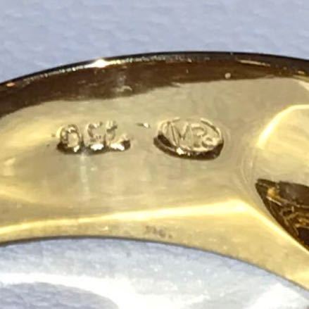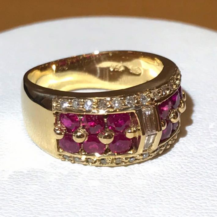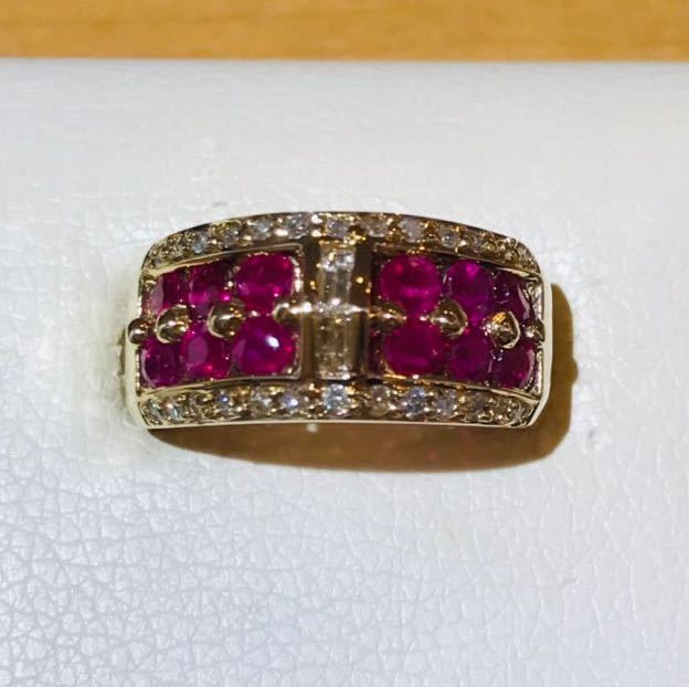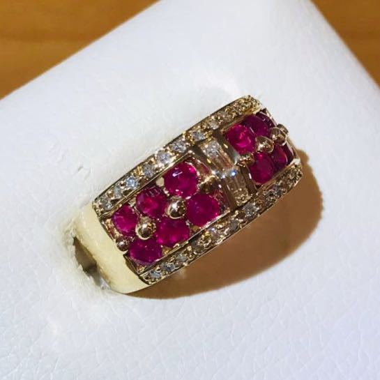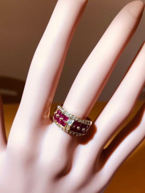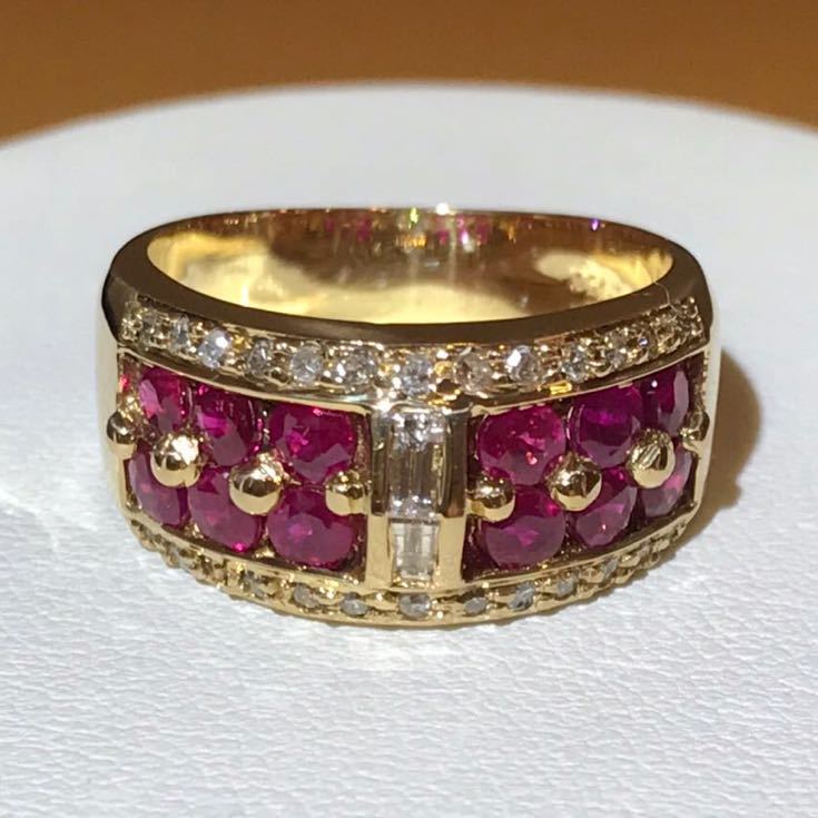 こちらは、YG750台にルビー12石、テーパーダイヤ2石、メレーダイヤ26石付きデザインリングです。