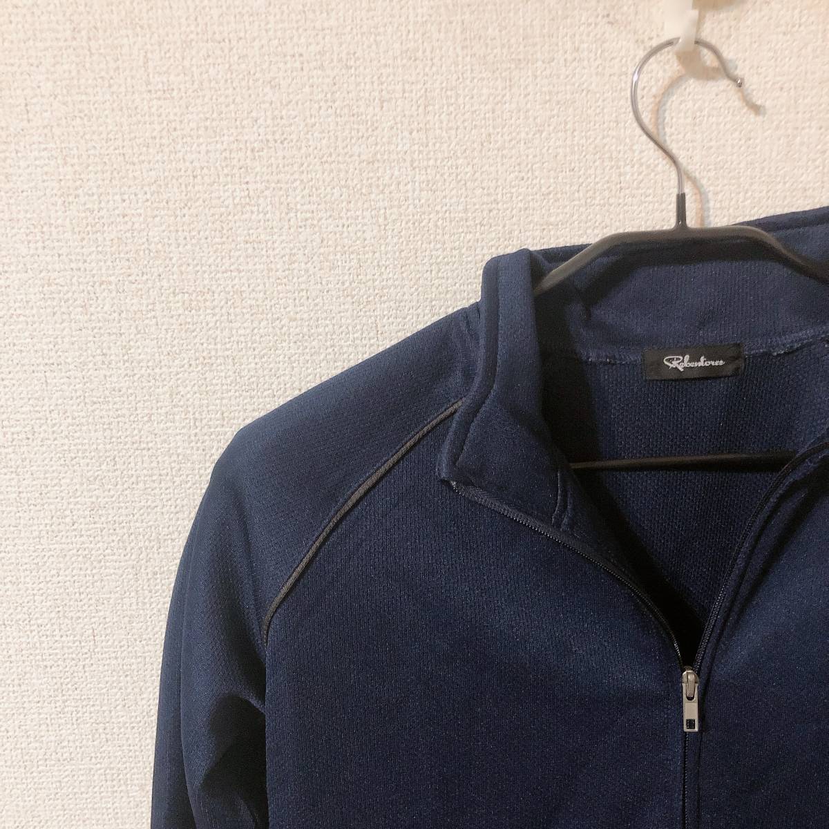 Mサイズ 紺色のジャージです。 前がチャックで全開できるので、重ね着をして調節できるのがいいですね。 左右にポケットがあるのも便利です♪ |