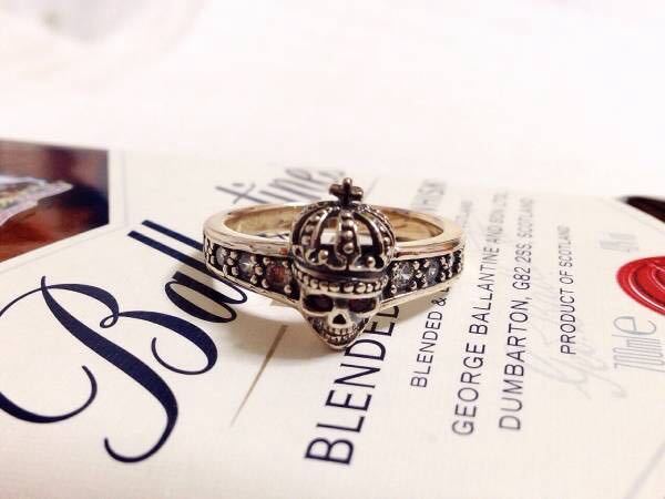 『気品漂うクラウン(王冠)を被ったスカルをモチーフにしたゴシック調のリングです。スカルの目の部分にルビー、そしてその両サイドに8石のCZダイヤをあしらいました。画像だけでは伝わらないのが残念ですが、クラウン&スカルモチーフの彫金、煌びやかな石の細工とその輝きが大変美麗な仕上がりとなっております。多数サイズを揃えましたので、ペアリングをお探しの方や極上のスカルリングをお探しの方にも是非、オススメ致します』