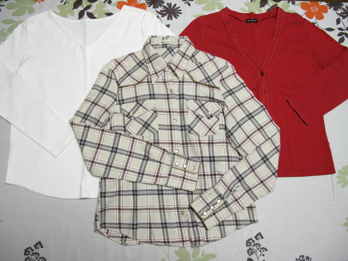 美品 3枚セット S 綿100% リオ カーディガン 8分袖 赤 IKKA シャツ 長袖 ベージュ系 チェック カットソー Vネック 長袖 白