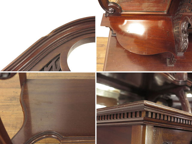 所々に少しのカケ、天板と下なたにニスハゲ、ミラーに腐食と曇りがありますのでお写真でご確認ください。