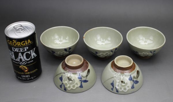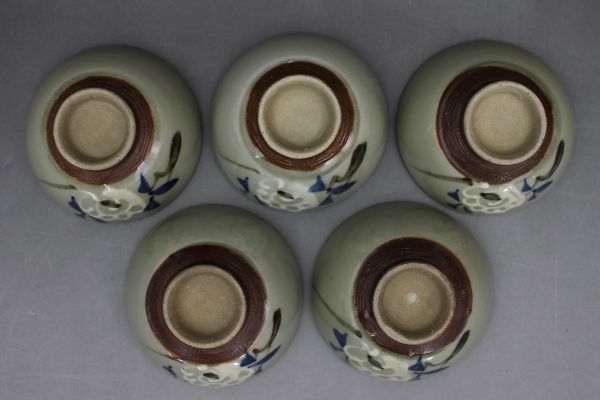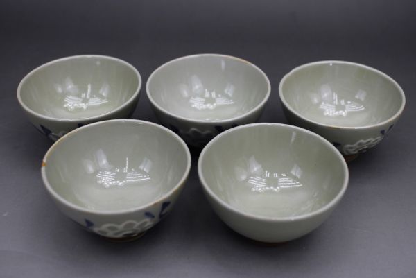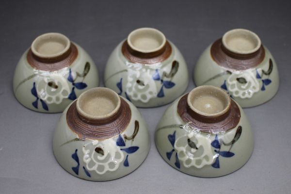 C-470 未使用品 三朝焼 湯呑 花紋 5客 山陰 鳥取 民藝 煎茶道具 蔵出 古玩