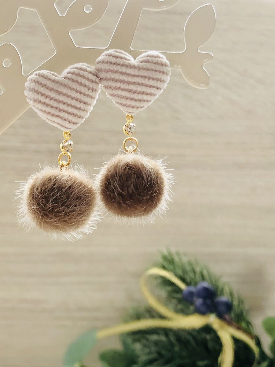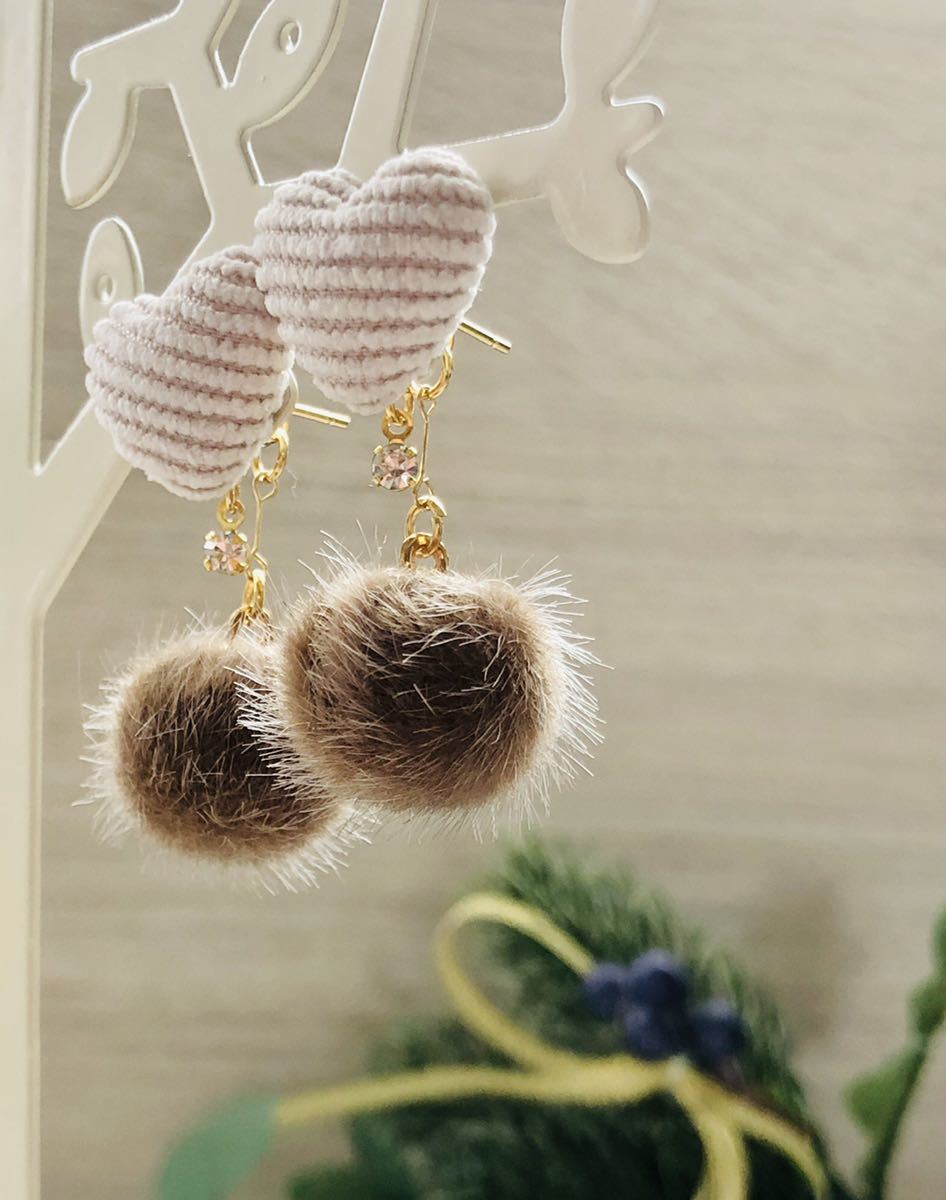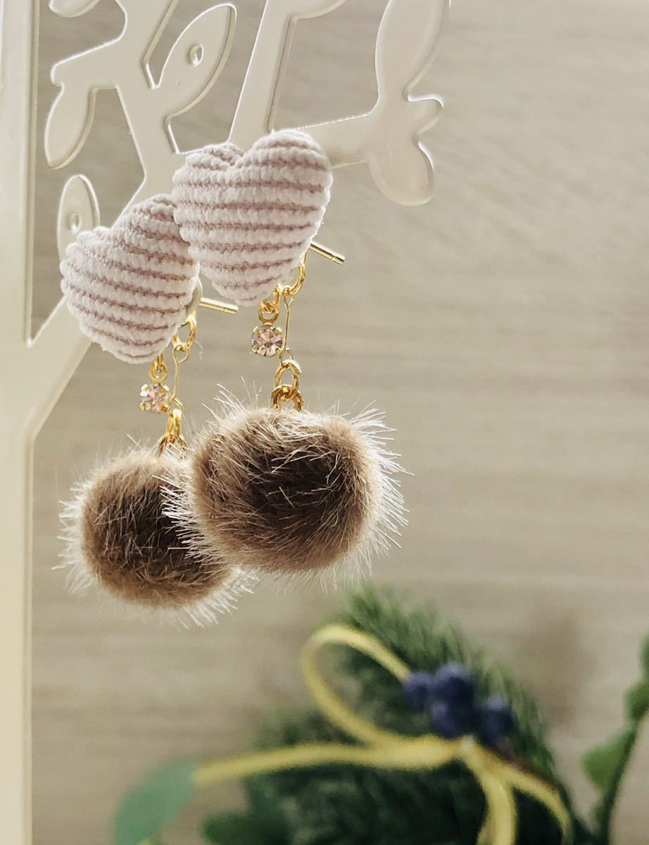 オフホワイト色のコーデュロイハートピアスの下に約3㎜のガラスチャームを飾り付け、キャッチ部分には、ブラウン色のファーボールを飾り付けました。