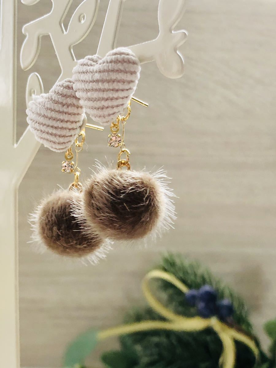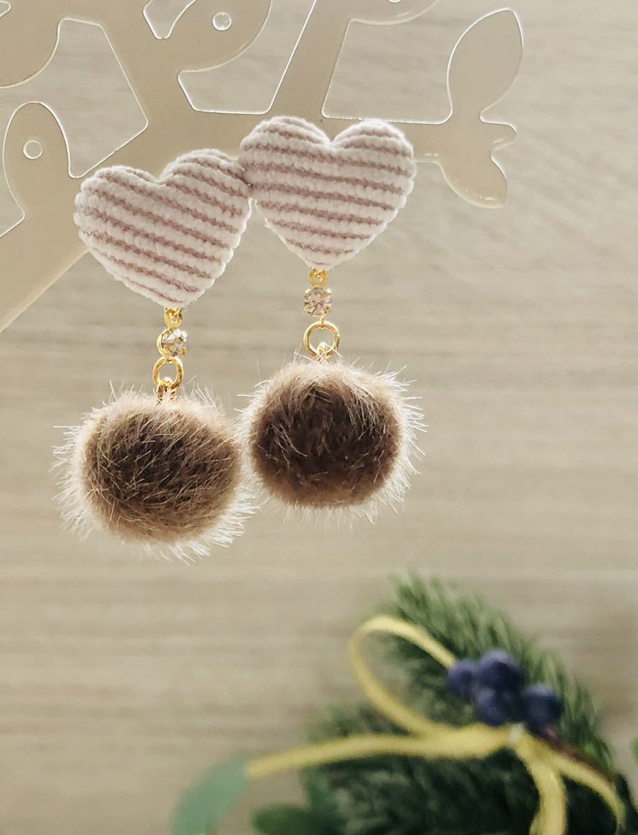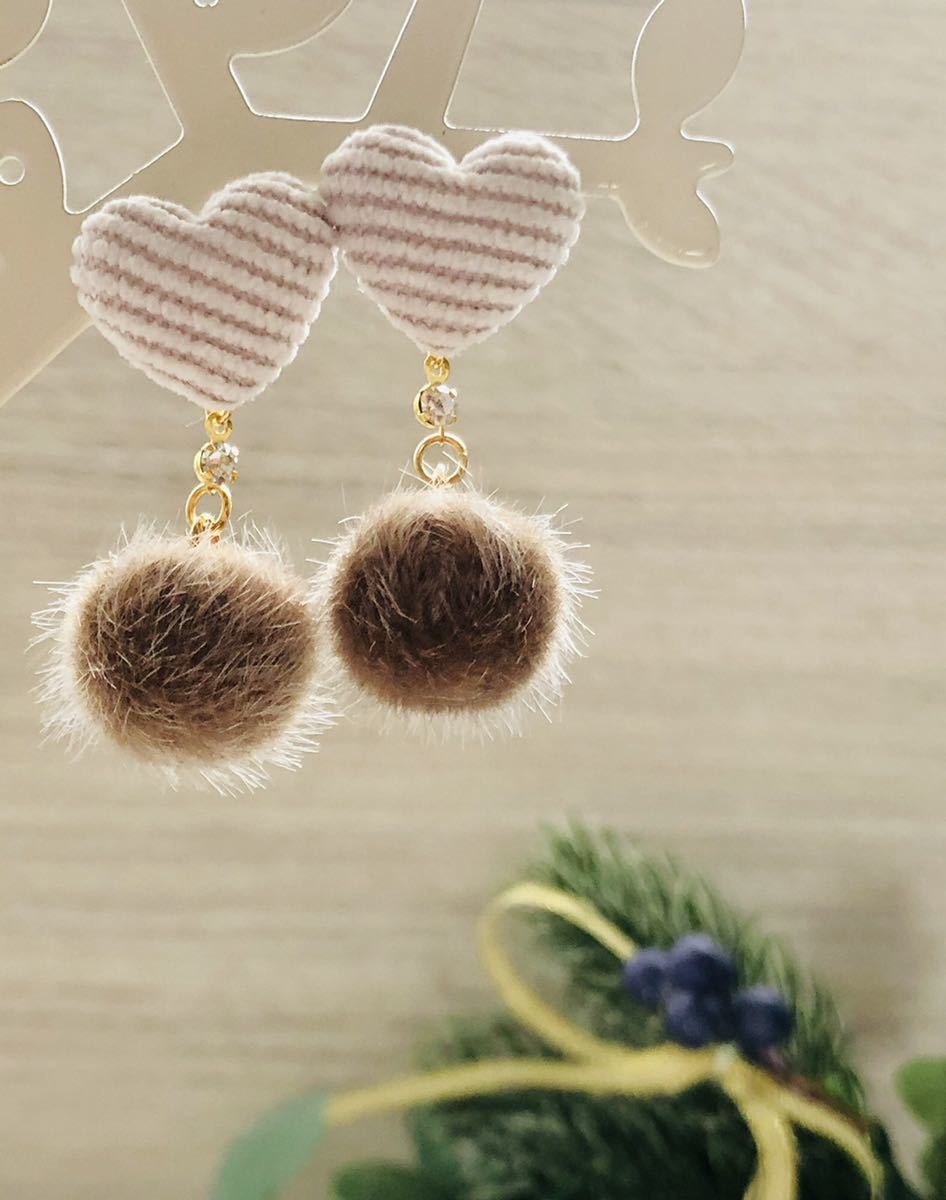 オフホワイト色のコーデュロイハートピアスの下に約3㎜のガラスチャームを飾り付け、キャッチ部分には、ブラウン色のファーボールを飾り付けました。