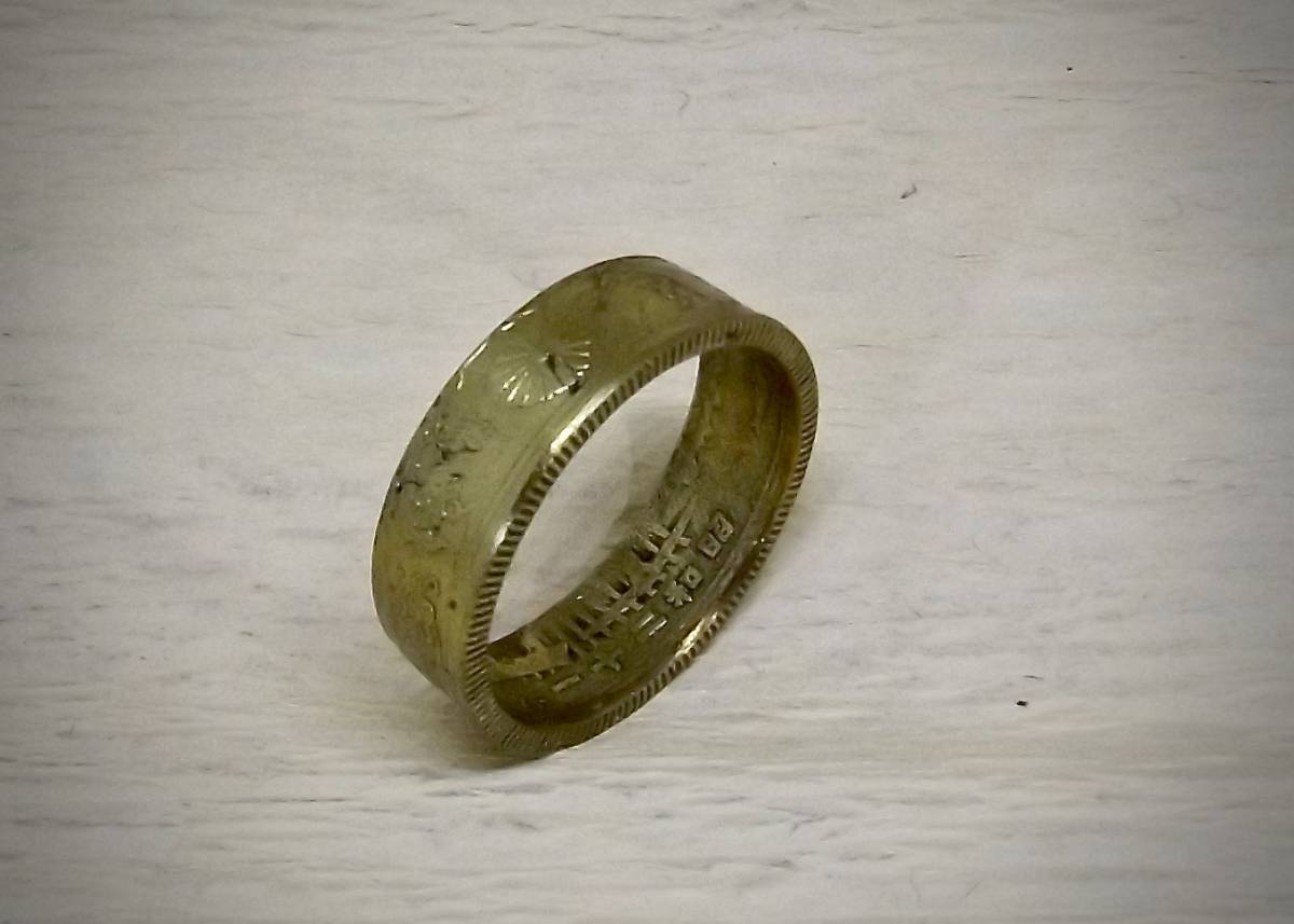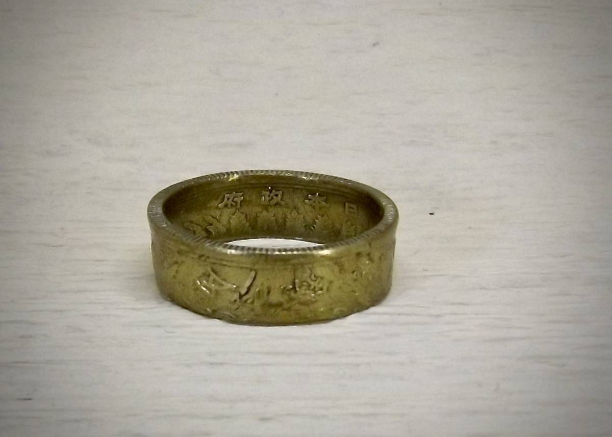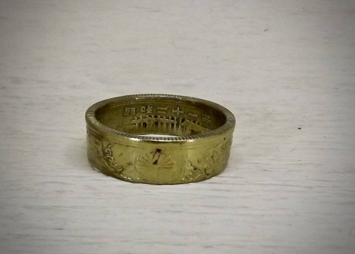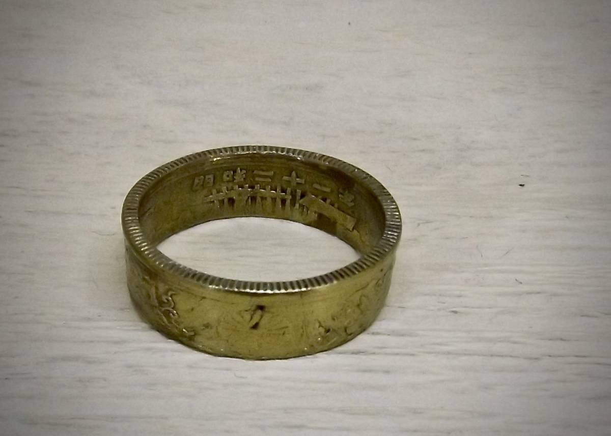 この商品は、昭和21年発行の 大型50銭黄銅貨を使用し、銅貨に穴を明け木槌で叩いてリングに成形した1点ものです。