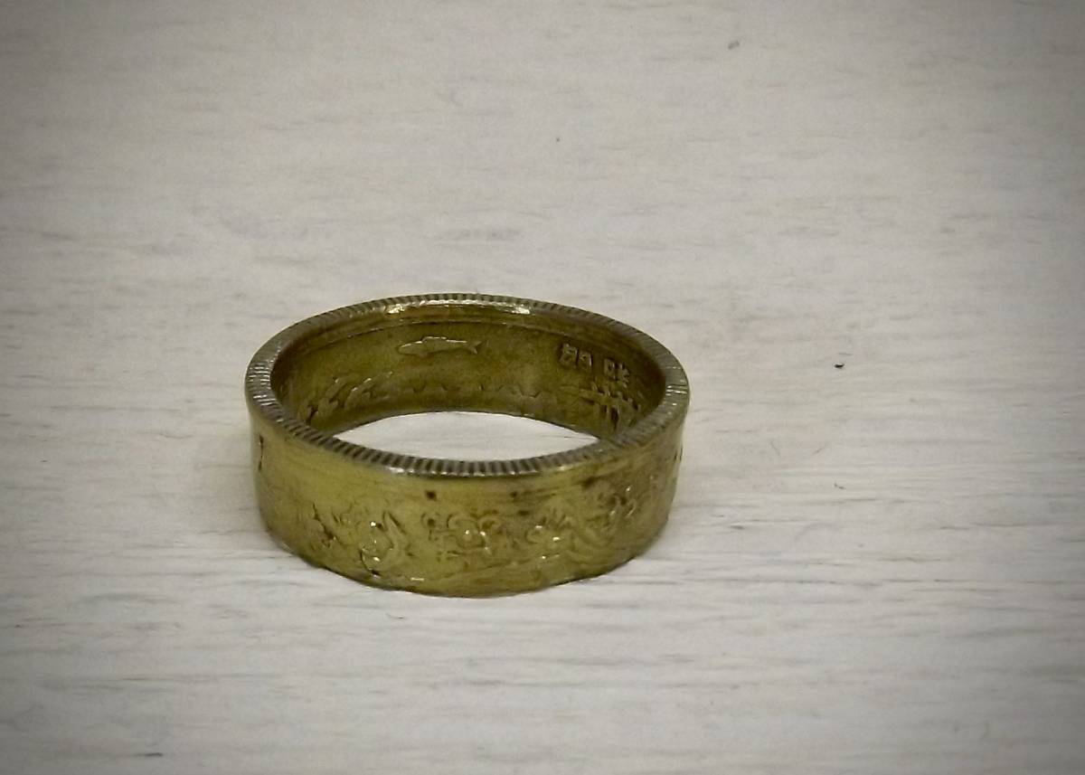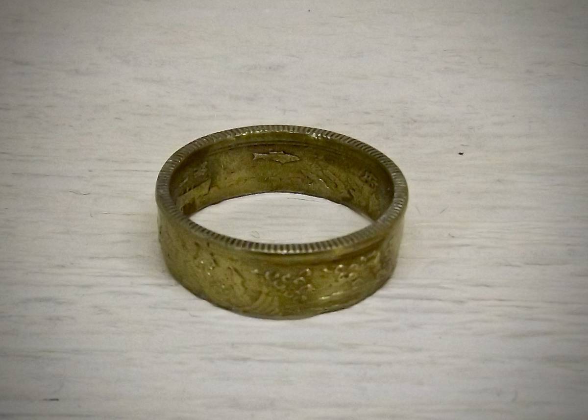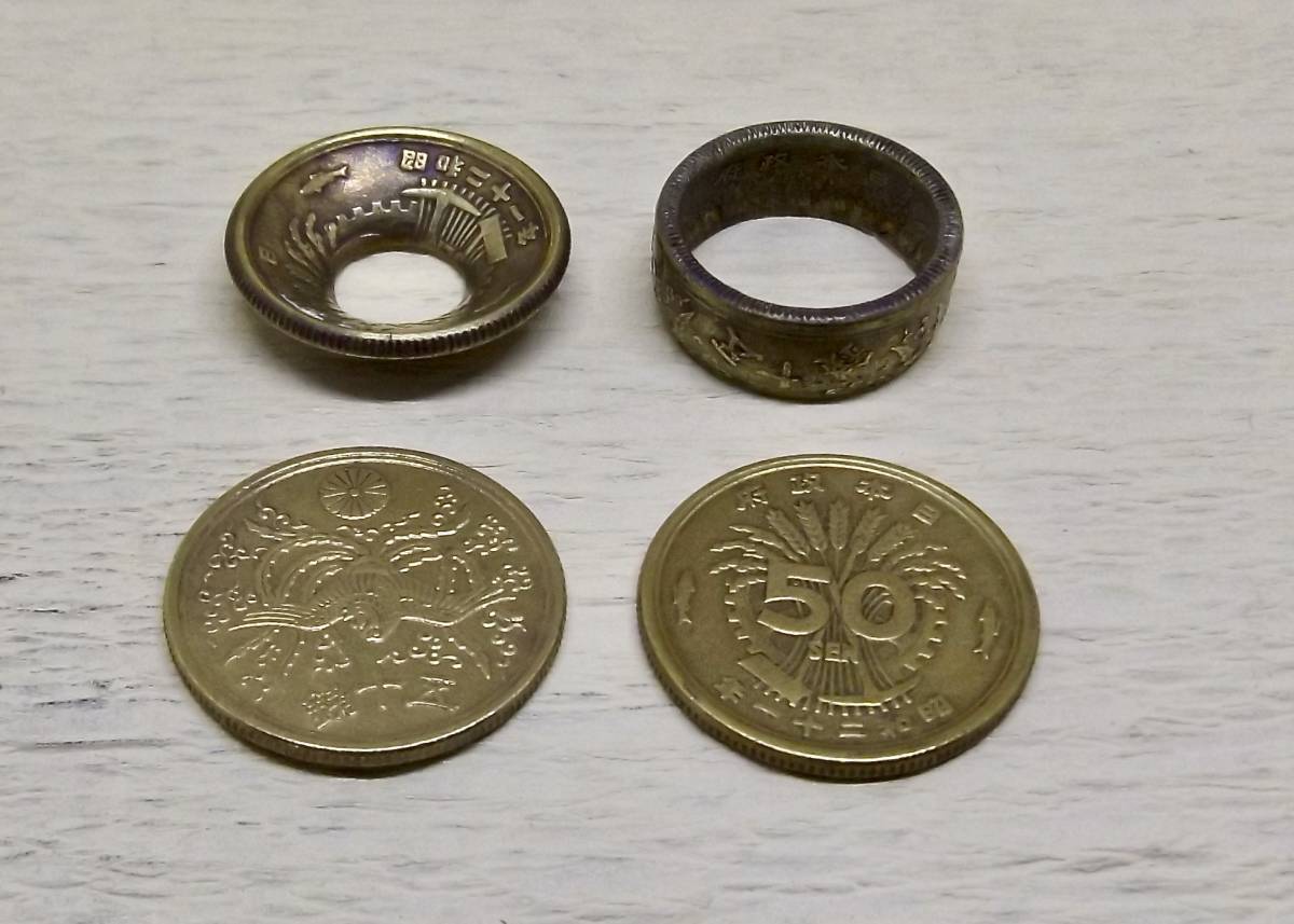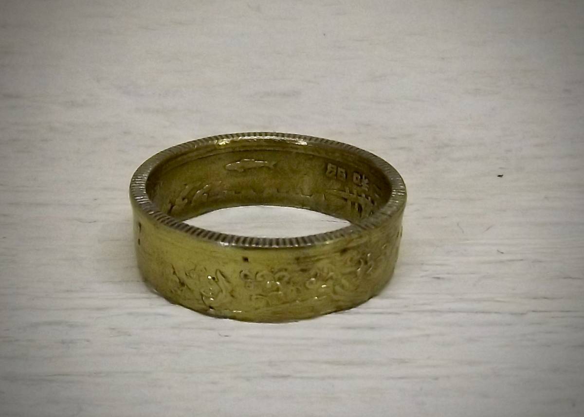 この商品は、昭和21年発行の 大型50銭黄銅貨を使用し、銅貨に穴を明け木槌で叩いてリングに成形した1点ものです。