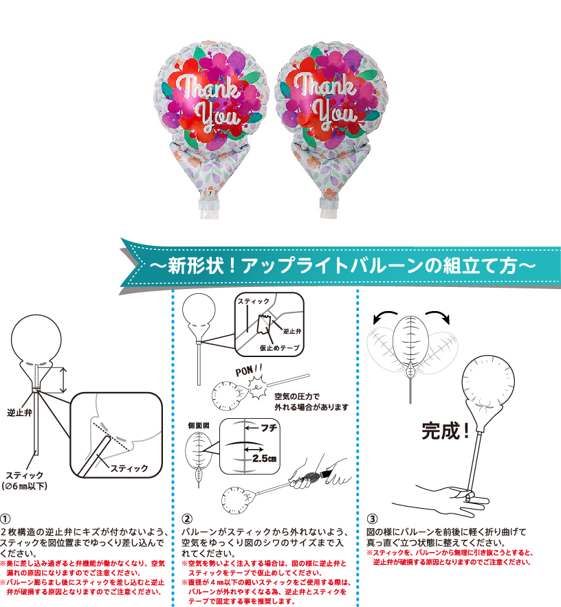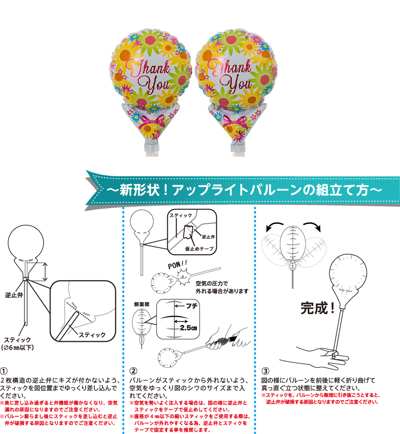 スティック部分よりエア補給ができる長持ちバルーンです。スティックには直径6mm以下のストローをお使いください。