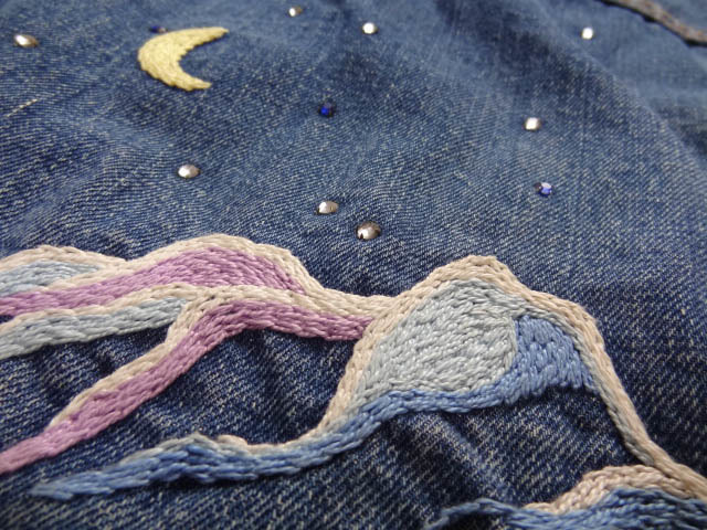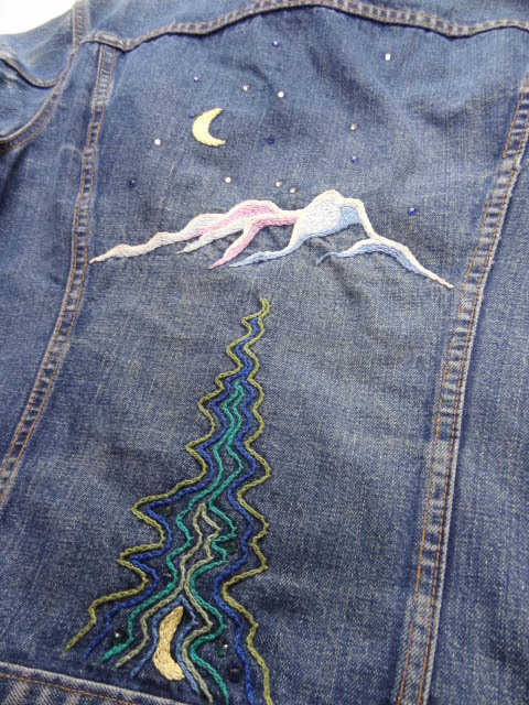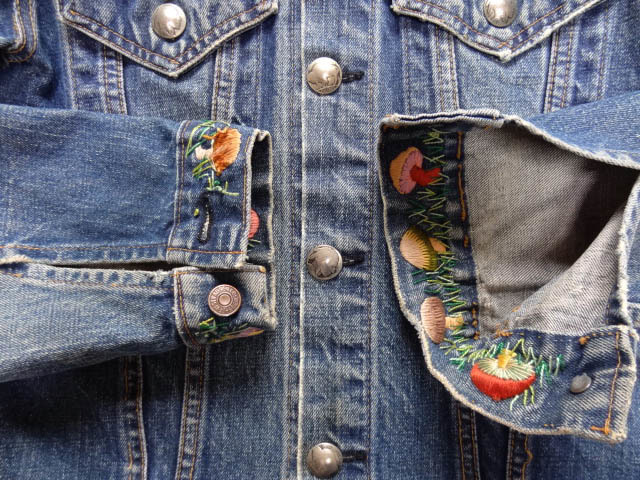 ボタンは袖以外の全てをコンチョボタンにカスタム,袖先表裏共に刺繍ワーク,背中には夜景が刺繍されています。わかりにくいですが夜空には星に見立てたラインストーンとスタッズがちりばめられています。どれだけクォリティーの高いカスタムかがおわかり頂けると思います。カスタムものは数えきれないほど見てきましたが,勢いとその場のひらめきで作ったものと完成をはじめに頭で描いて作られたものとではかなりの差がでます。そういった差までこだわって見てきたなかのコレクションのうちの1つです。探してもここまでのトップクラスは見つかることはありません