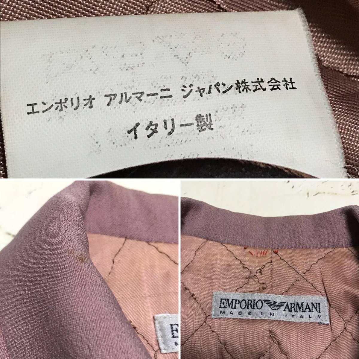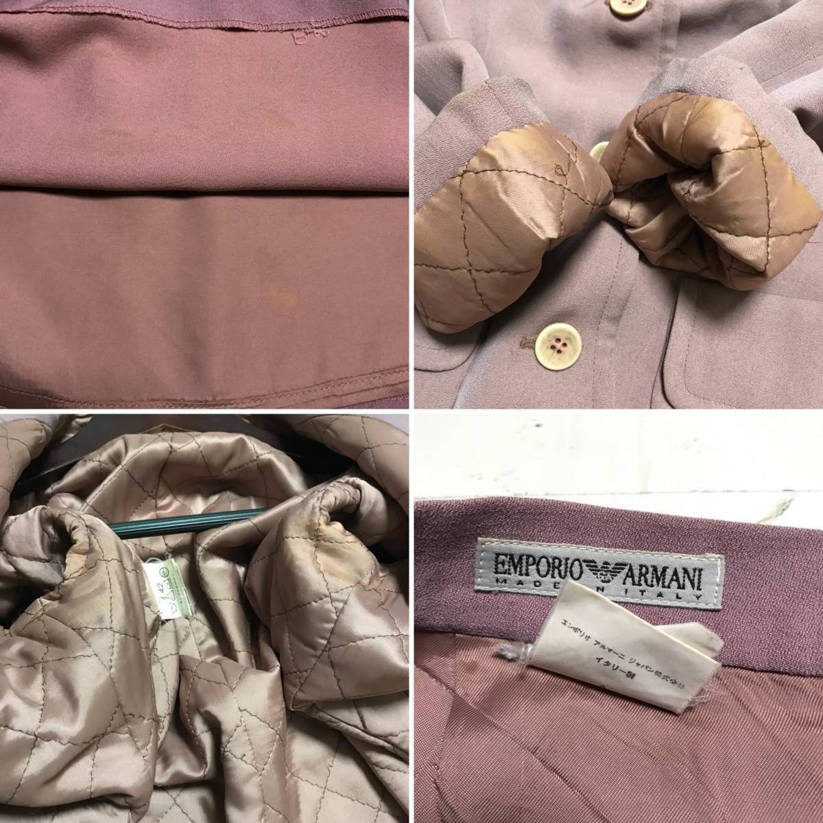 **当ページをご覧頂き、誠にありがとうございます。必ず、自己紹介文を確認の上、入札をして頂くようお願い致します** ※※※定期的にお値下げ、お品物のアップをしているので是非アカウントのフォロー&ウォッチをお願いいたします!※※※ ***商品説明*** ★EMPORIO ARMANI エンポリオ アルマーニ★スカートスーツ 上下 セットアップ スーツ★ラベンダー系★size 42★ウール レーヨン★ SSS ★***カラー***★ ラベンダー系 ★***素材表記***★ ウール 60% レーヨン 28% ナイロン 12%, 裏地:レーヨン 100% ★***状態***★ 10段階評価中:ジャケット:7 袖口裏、脇、襟もとにしみ 小さなしみあり。 スカート:7 裏地にしみあり。 <状態について> ☆(10).dead stock:新品、未使用品。 ☆(9).mint:殆ど使用感のない美品。 ☆(8)very good:数回程度しか使用されていない美品。 ☆(7)good:使用感はあるが、目立つダメージのない物。 ☆(6)USED:気にならない程度のスレやキズがあるだけの物。 ☆(5)USED:使用感があり目立つキズやシミがある物。 ☆(2)~(4)USED:非常に目立つキズやシミがある物。 ☆(1)outlet:使用するには難有りな物。修復が必要な物。 ”ボディ全体の雰囲気はランク8だが、脇に穴のみがあった”など、一点一点状態が異なりますので、番号は参考程度に、ランク番号右に備考があればそちらもご覧くださいませ。 ★***サイズ(平置き採寸(cm))***★ ジャケット 肩幅44(パッド) 着丈56 袖丈55 身幅47cm スカート ウエスト34 着丈49 裾幅48cm ★***サイズ(本体表記)***★ 42表記あり。 |