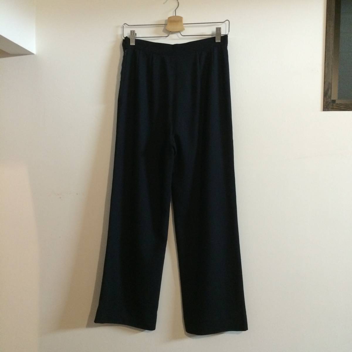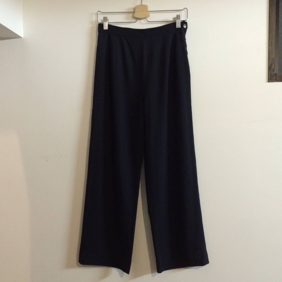 サイズは42、素人平置き実寸・ウエスト/約35cm、ワタリ幅/約29cm、股下/約68cm、裾幅/約24cmになります。