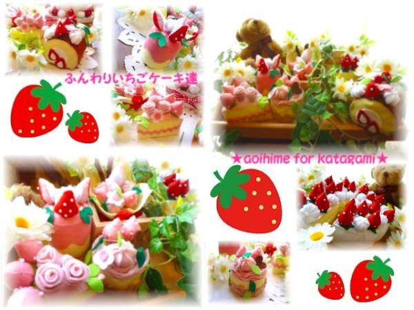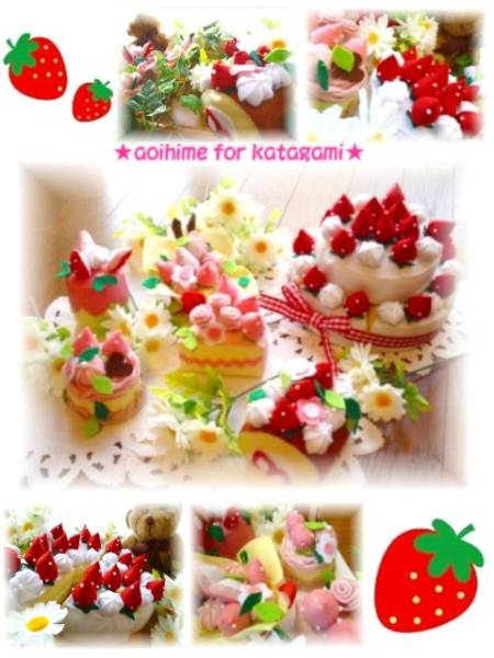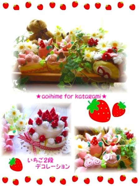 | この型紙でこーんなケーキが出来ちゃいます(*^^*) とってもキュートないちご達を使ってふんわり柔らかなイメージでかわいいケーキを作ってみました♪ 2段デコレーションの下段は6等分カットになっています(*^^*) 型紙は実寸大、ケーキサイズは本物のケーキと同じぐらいです♪ 初心者のお方でも大丈夫な様にステッチの方法も載せて作成しましたので是非!挑戦してみてね♪ 手作りを一緒に楽しみましょう♪ | |||