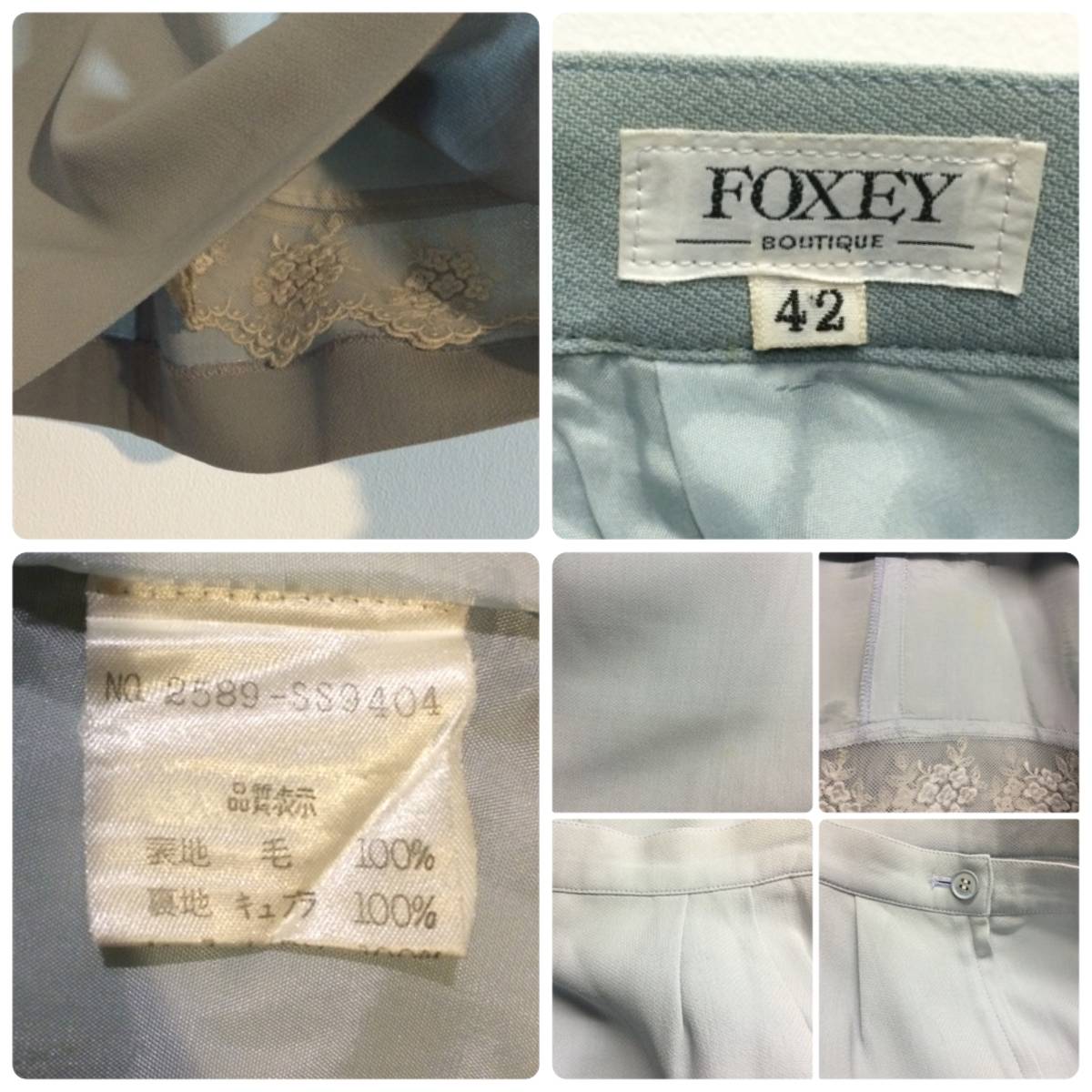 カラーはライトブルー系、素材は表/ウール100%、裏/キュプラ100%、レース/ナイロン100%になります。