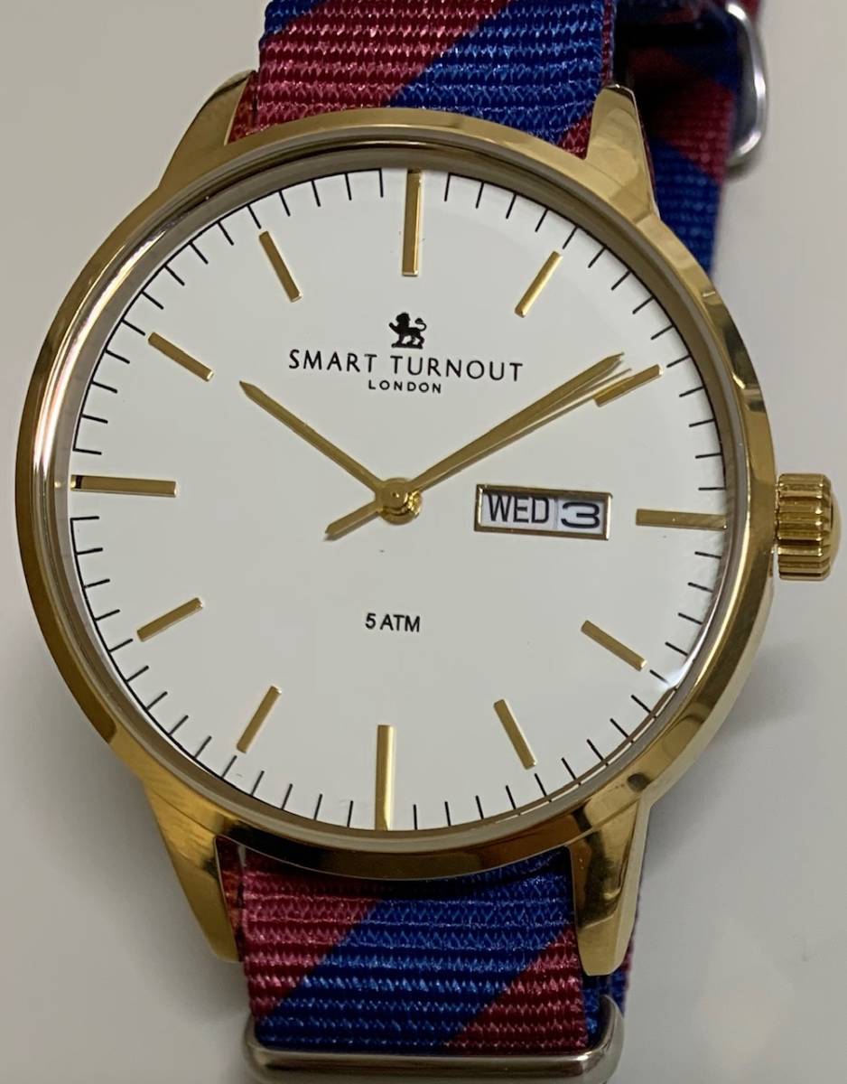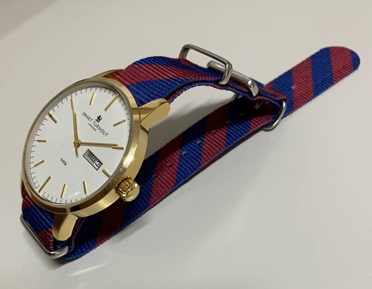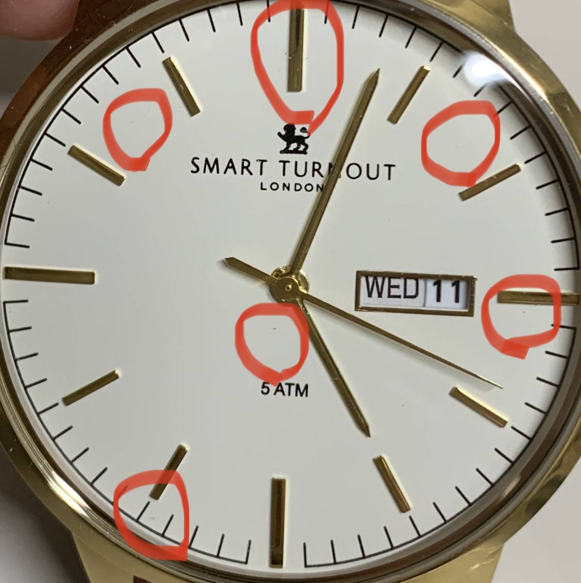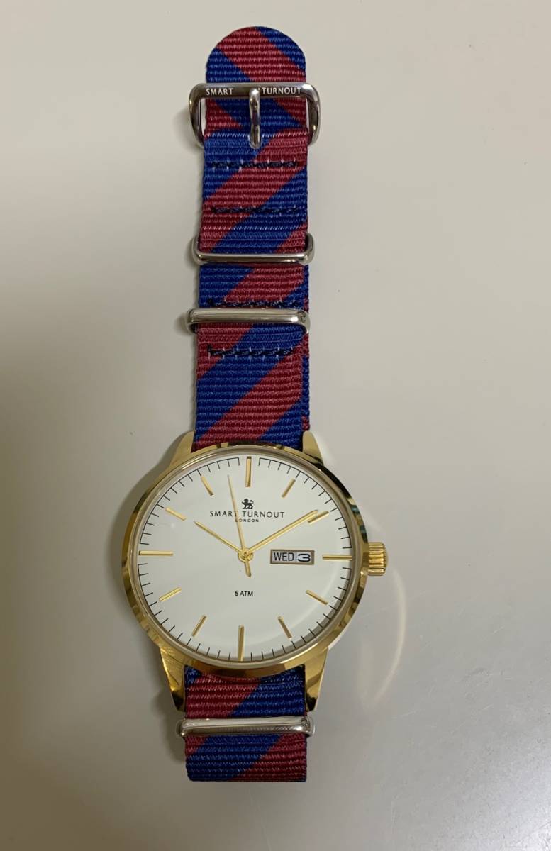 SMART TURNOUT Smart Turnout社の創設者であるフィリップ・ターナー氏は、元スコットランド近衛連隊の大尉でした。 1998年、兵役を引退後に親睦の競馬レース、サンダウンパーク競馬に出場する際に近衛連隊のカラーを使ったセーターを製造しました。 このセーターが有名になり、近衛連隊以外の他の連隊に対しても、数々の色鮮やかな商品を供給することとなりました。 その後、英国国内の高校や大学などからも製造の依頼を受けるようになってきました。 Smart Turnoutこそが英国軍隊、諸団体の精神に基づいた正真正銘の英国純正ブランドです。 現在では、時計、ネクタイ、カフス、ソックスをはじめ様々な身辺衣料雑貨を世界中のトラディッショナルな人々に供給しつづけています。 ※注意事項 返品は承っておりませんので、必ず以下ご確認及びご了承の上、落札をお願い申し上げます。 ・文字盤上に埃がございます。※お写真4枚目参照(特に目立つ箇所をマークしております。) ・裏蓋周辺に傷がございます。 ・針、インデックス及びカレンダー枠に細かい傷がございます。 ・動作はしております。 以上、特価商品の為、ご理解いただきますようお願いいたします。 |