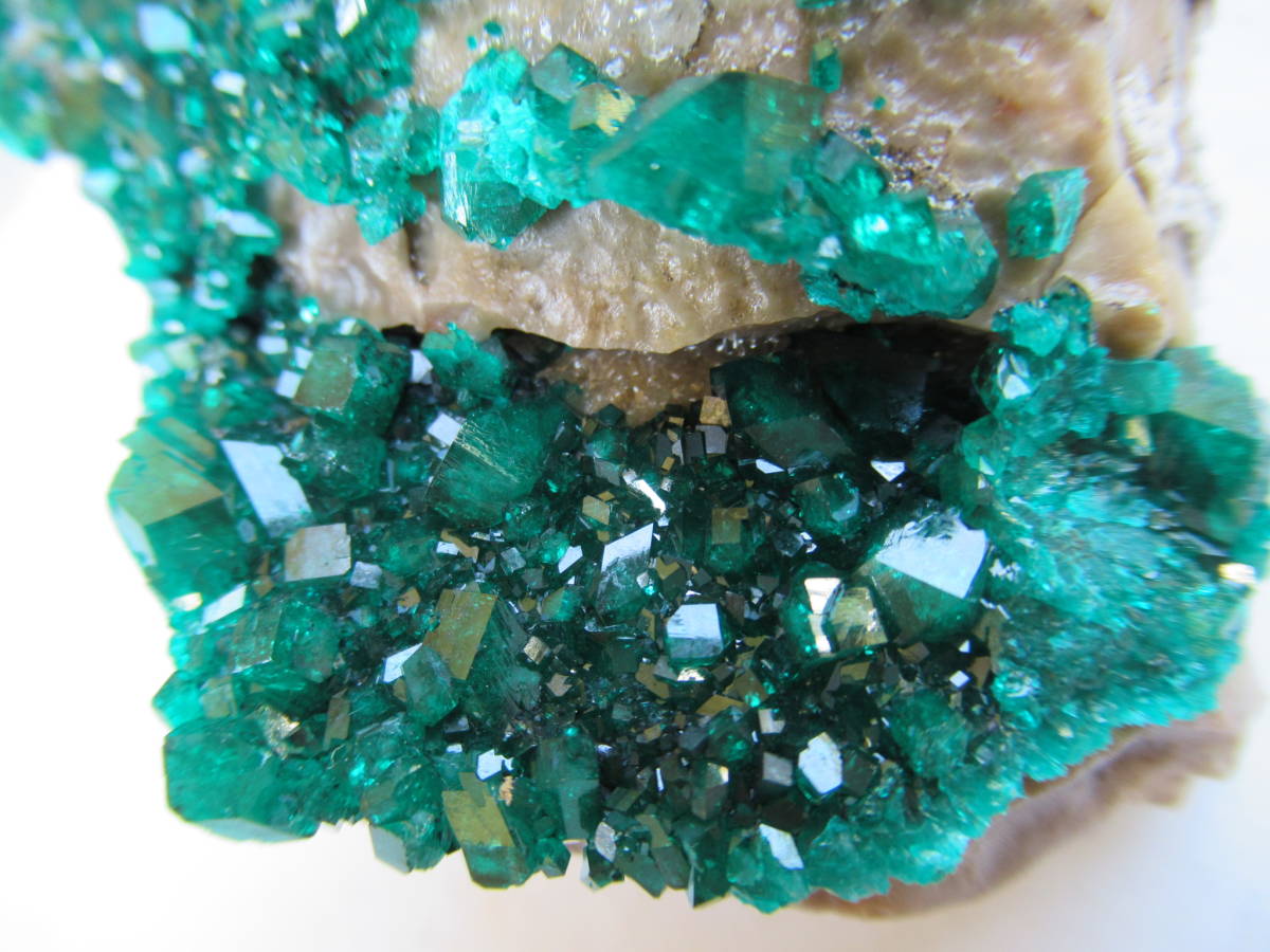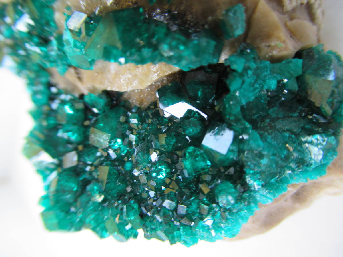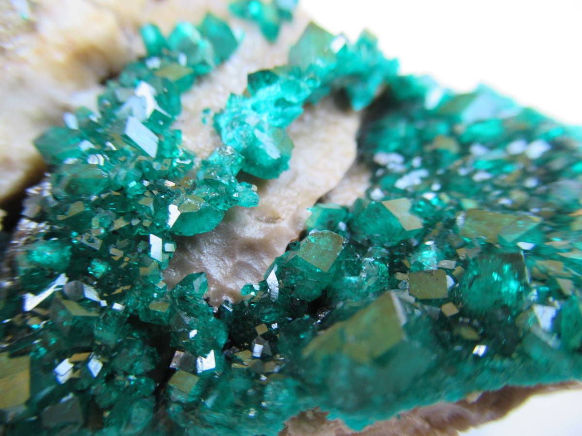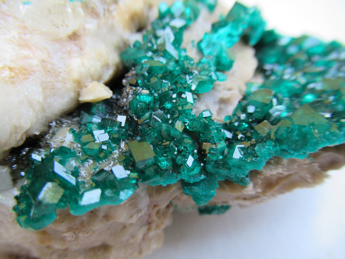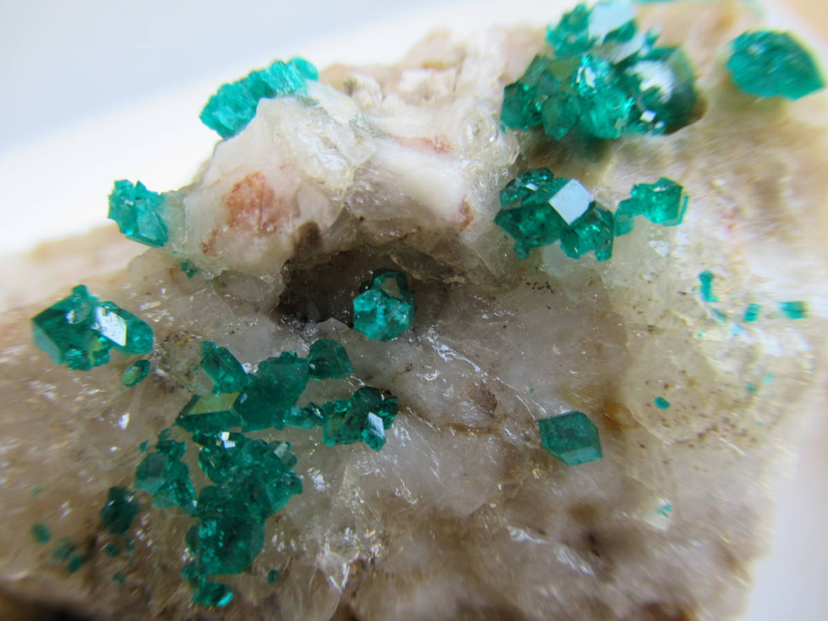 カザフスタンAltyn Tyube産の翠銅鉱ですが、2000年前後に入手した本品は当地産としてはキラメキが強いように思い、よく見ると、ガラス光沢の無色方解石を酸で溶かしたと思われる部分が見られました。おそらく翠銅鉱の結晶のかなりの部分が方解石に埋もれて新鮮に保たれていたものと思います。最大結晶の1辺5mmほど。全体の横幅74mmほど。送料無料。