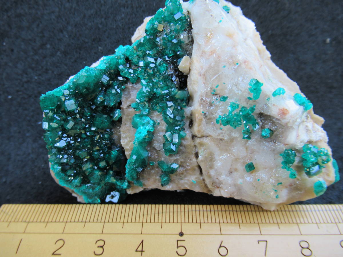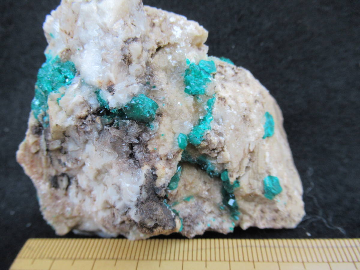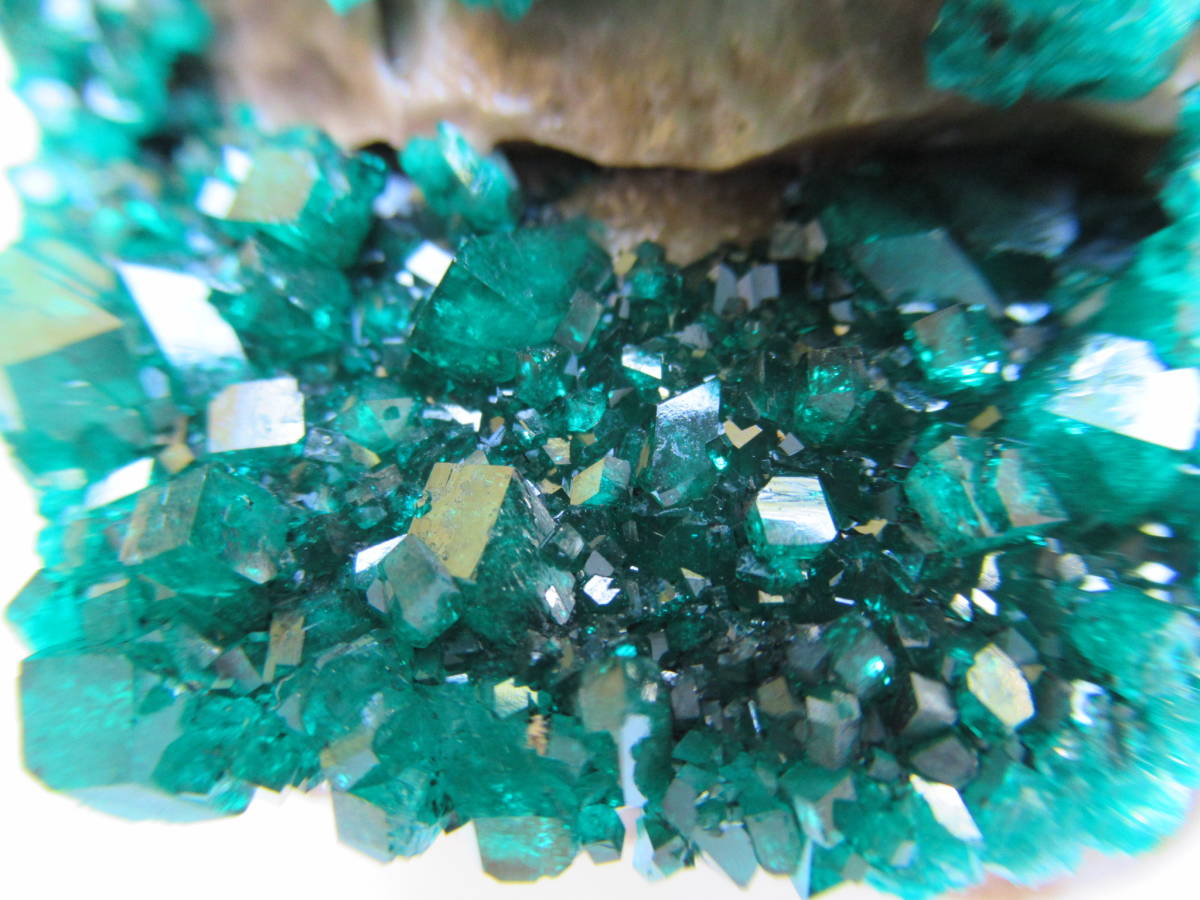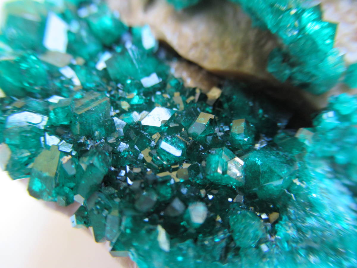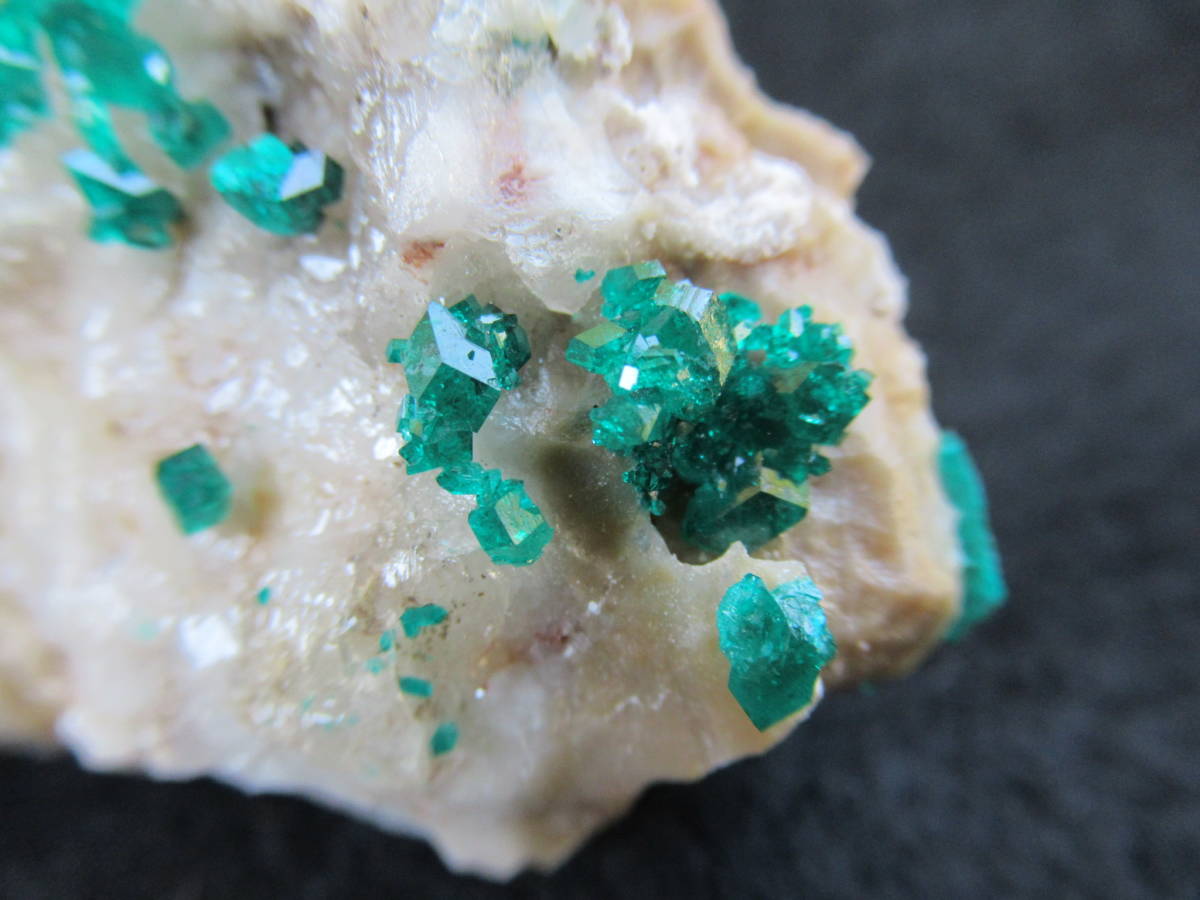 カザフスタンAltyn Tyube産の翠銅鉱ですが、2000年前後に入手した本品は当地産としてはキラメキが強いように思い、よく見ると、ガラス光沢の無色方解石を酸で溶かしたと思われる部分が見られました。おそらく翠銅鉱の結晶のかなりの部分が方解石に埋もれて新鮮に保たれていたものと思います。最大結晶の1辺5mmほど。全体の横幅74mmほど。送料無料。