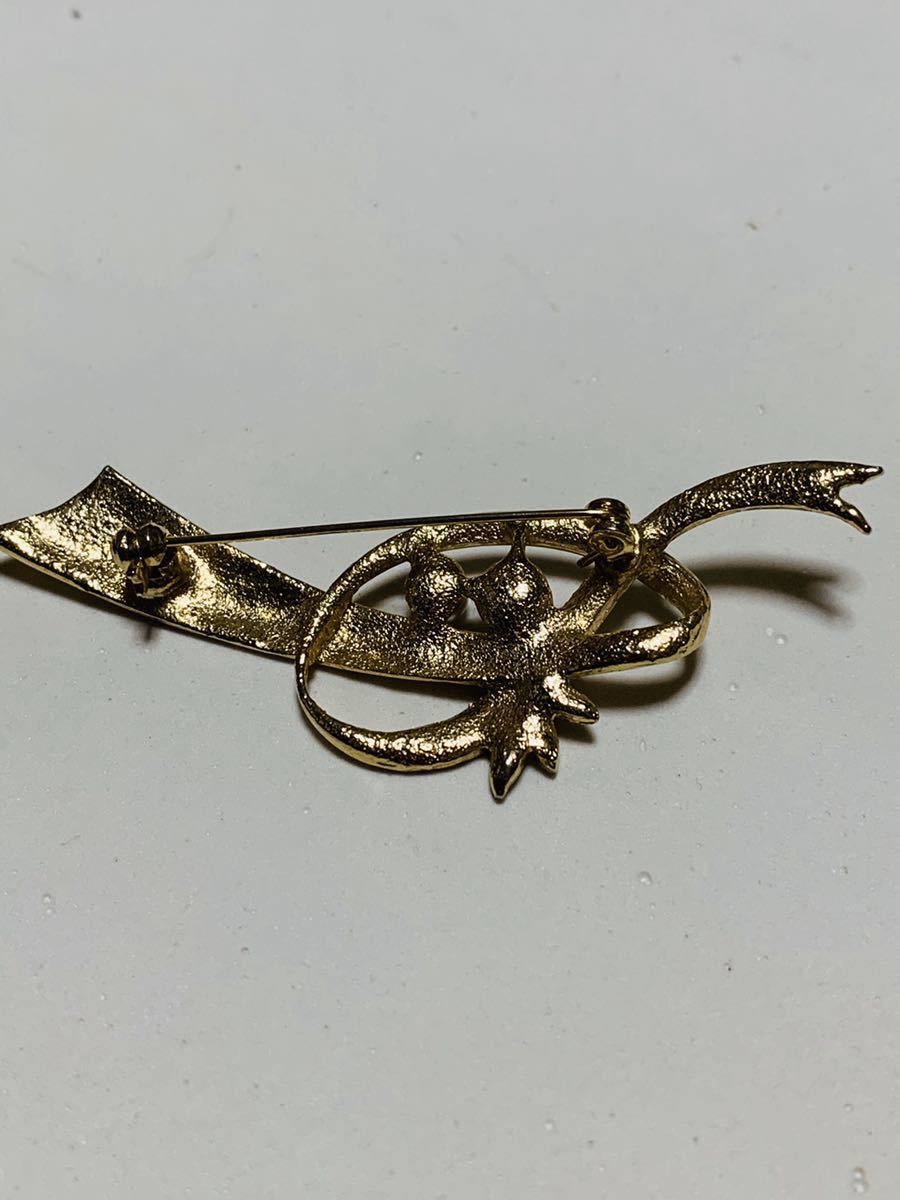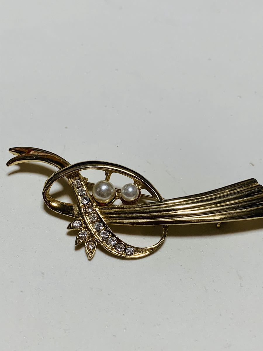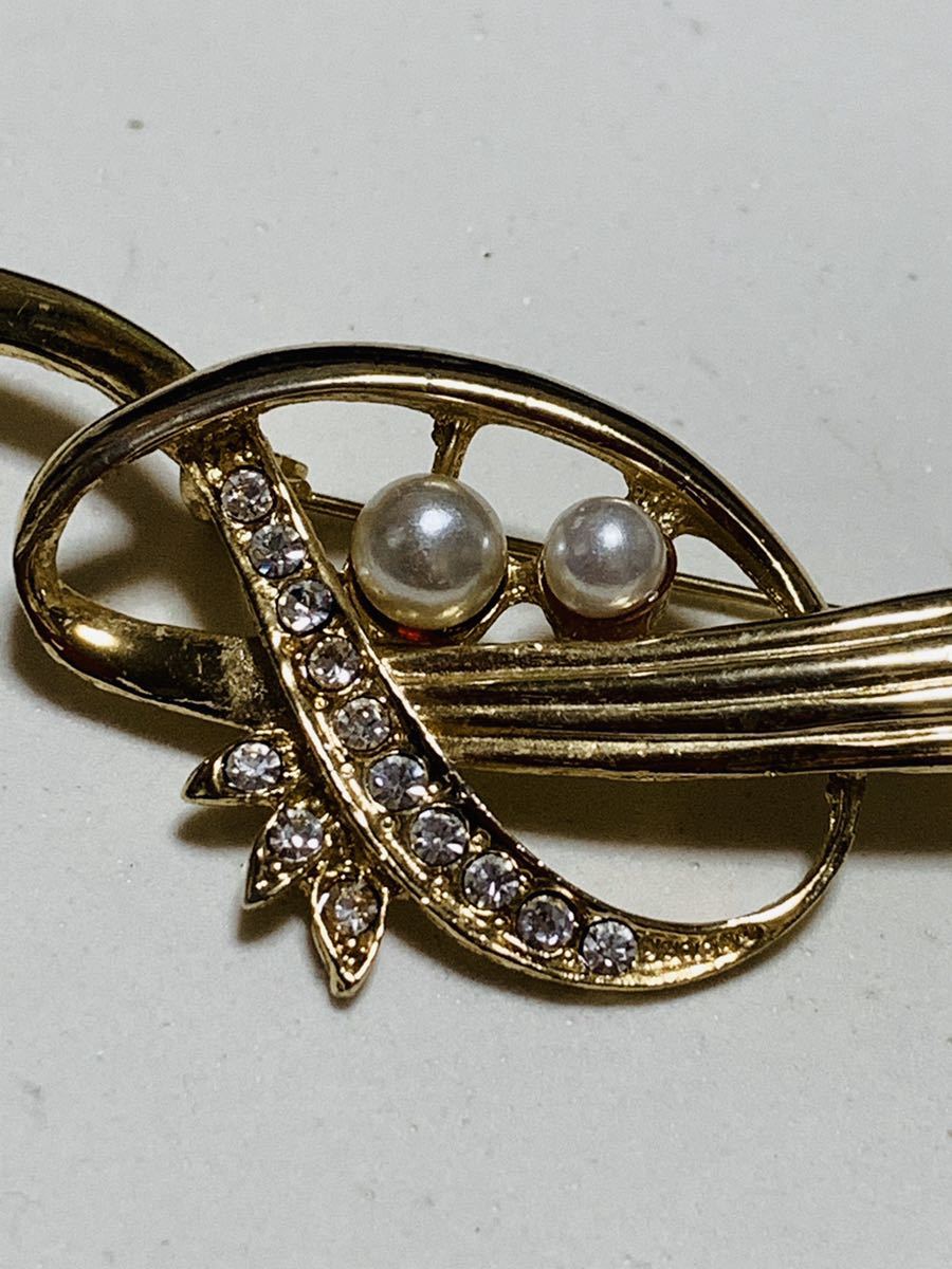 本真珠とジルコニアの、ゴールドカラーの美しい結み目ブローチです、サイズは27×80ミリの美しいブローチです