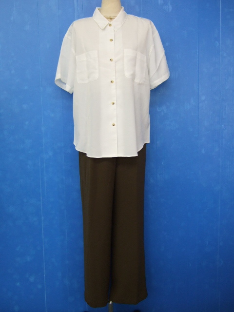 ①「LOVEFACE」の半袖ブラウスと②「RYB」のロングパンツとのレディース上下2点セットです。