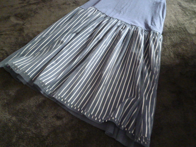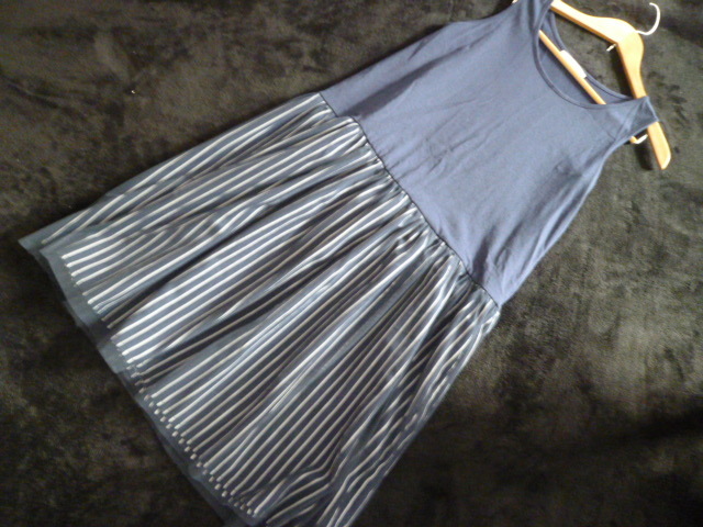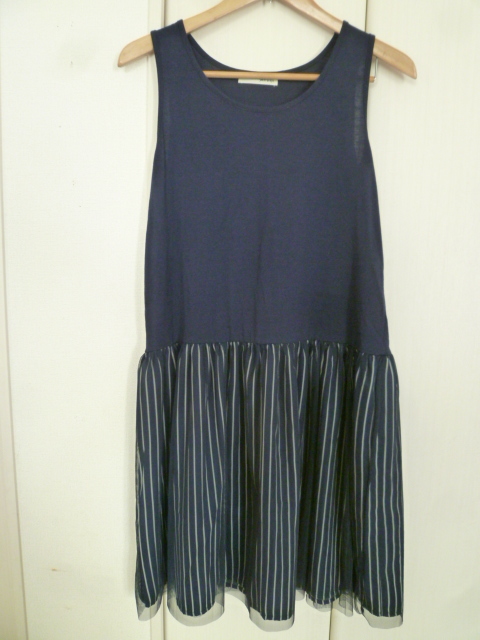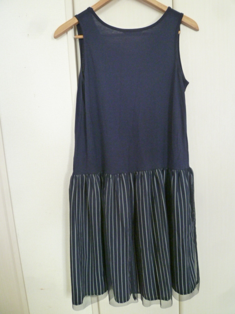 SHOO-LA-RUE/シューラルー△紺オーガンジーチュールストライプ異素材ドッキングペチコートワンピースM/ネイビー膝丈ワールド△OP122