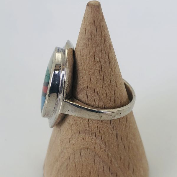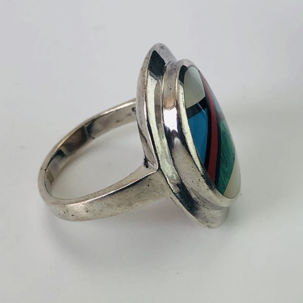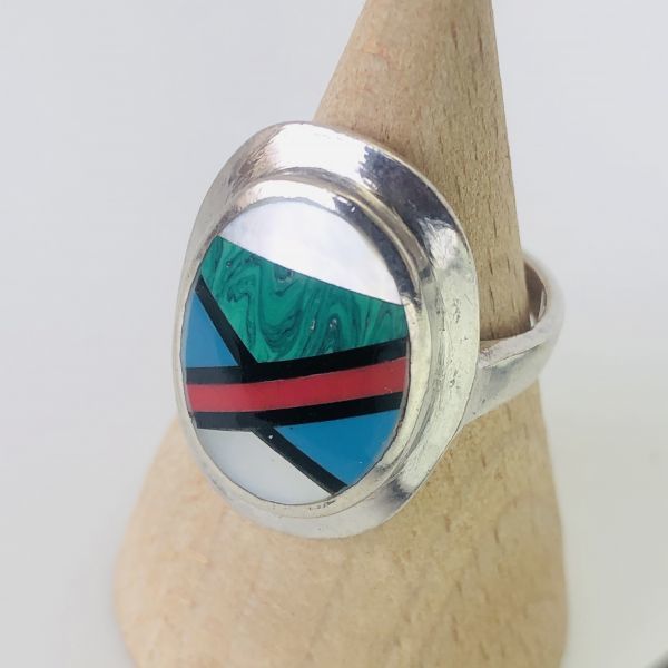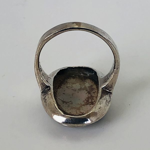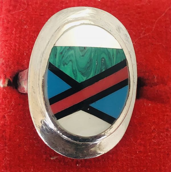 年代 :1970's前後辺り サイズ :リング約13号(直径16.8mm) / 石 縦 2.2cm x 横幅 1.5cm 素材 :STERLING 銀925 : ブラックオニキス/ 加工シェル(マザーオブパール / マラカイトなど 重さ :約 6g 製造国 :アメリカ 民族工芸 :ズニ族 インディアンジュエリー 刻印 :925 アメリカで買い付けたビンテージ、ズニ族のシルバーリングです。 天然石と加工シェルのインレイでズニ族らしいデザインになっております インディアンジュエリー特有の歪みやキズがありますので理解の上、購入下さい。 載せている全ての商品はアンティーク品のため、使用感、小キズ、等は御座いますので写真を良く見てアンティーク品として理解されている方のみ購入下さい。 | |||