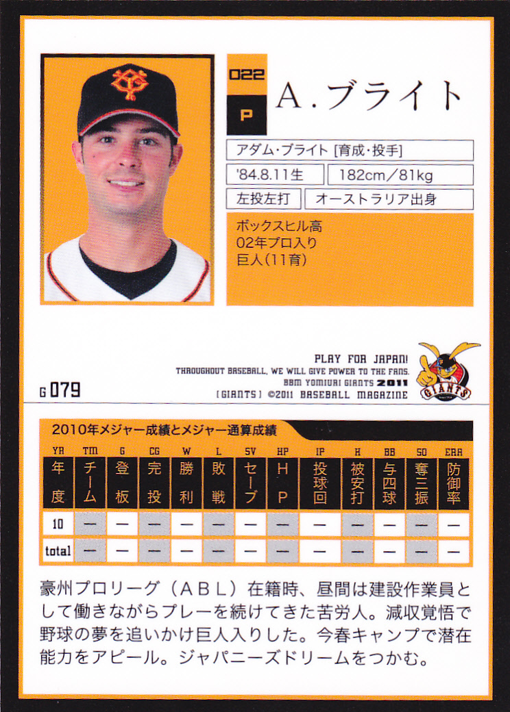 BBM2011読売ジャイアンツ G079 アダム・ブライト オーストラリア 巨人
