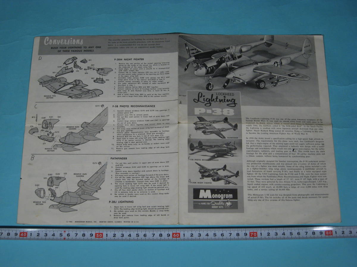 出品はご覧のモノグラム 1/48米国陸軍 ロッキード ライトニング P-38組立説明書のみでスケールはオークション外です。