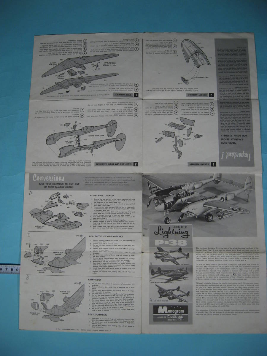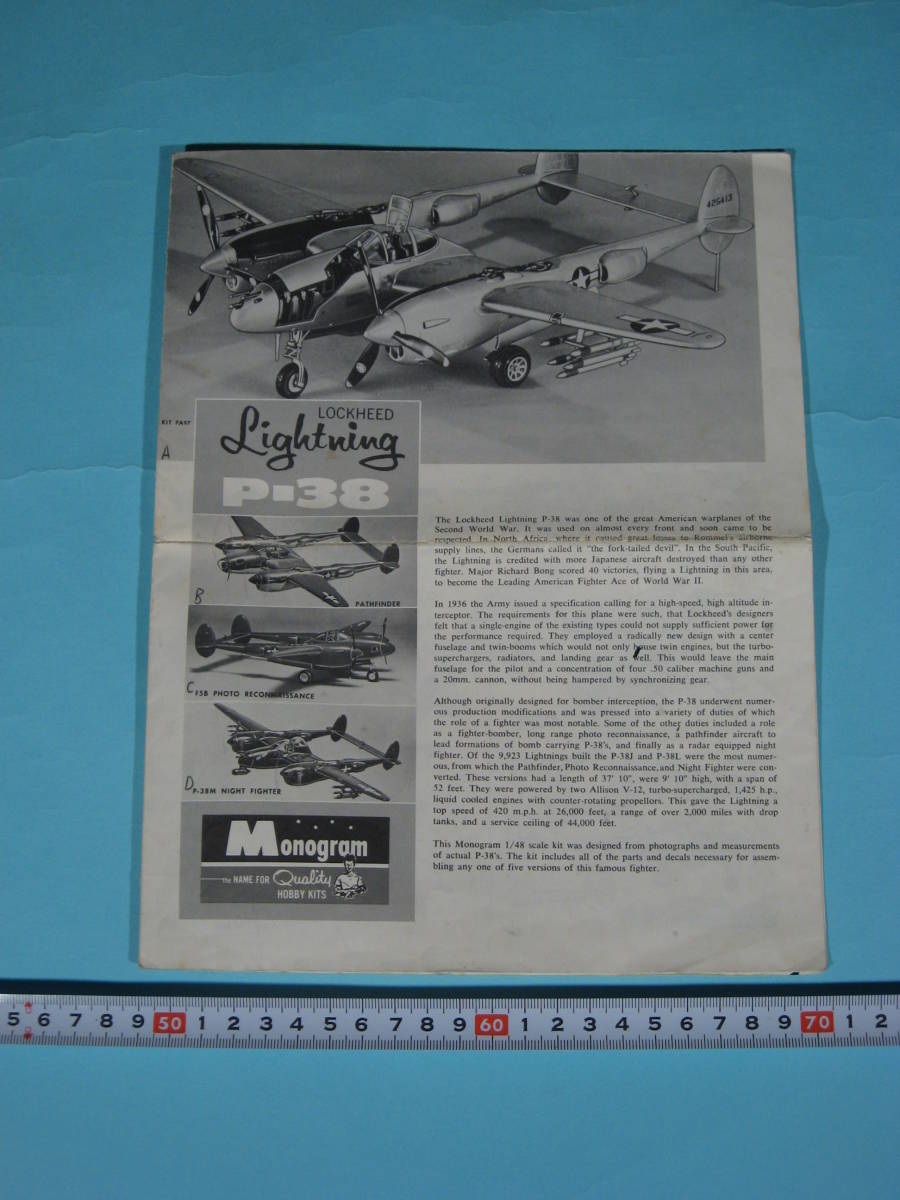 1986年にアメリカレベルと統合され2018年に倒産したモノグラムの60年近い昔のキットのモノグラム1/48米国陸軍 ロッキード ライトニング P-38組立説明書(英語版 縦27.8cm、横21.6cm)です。