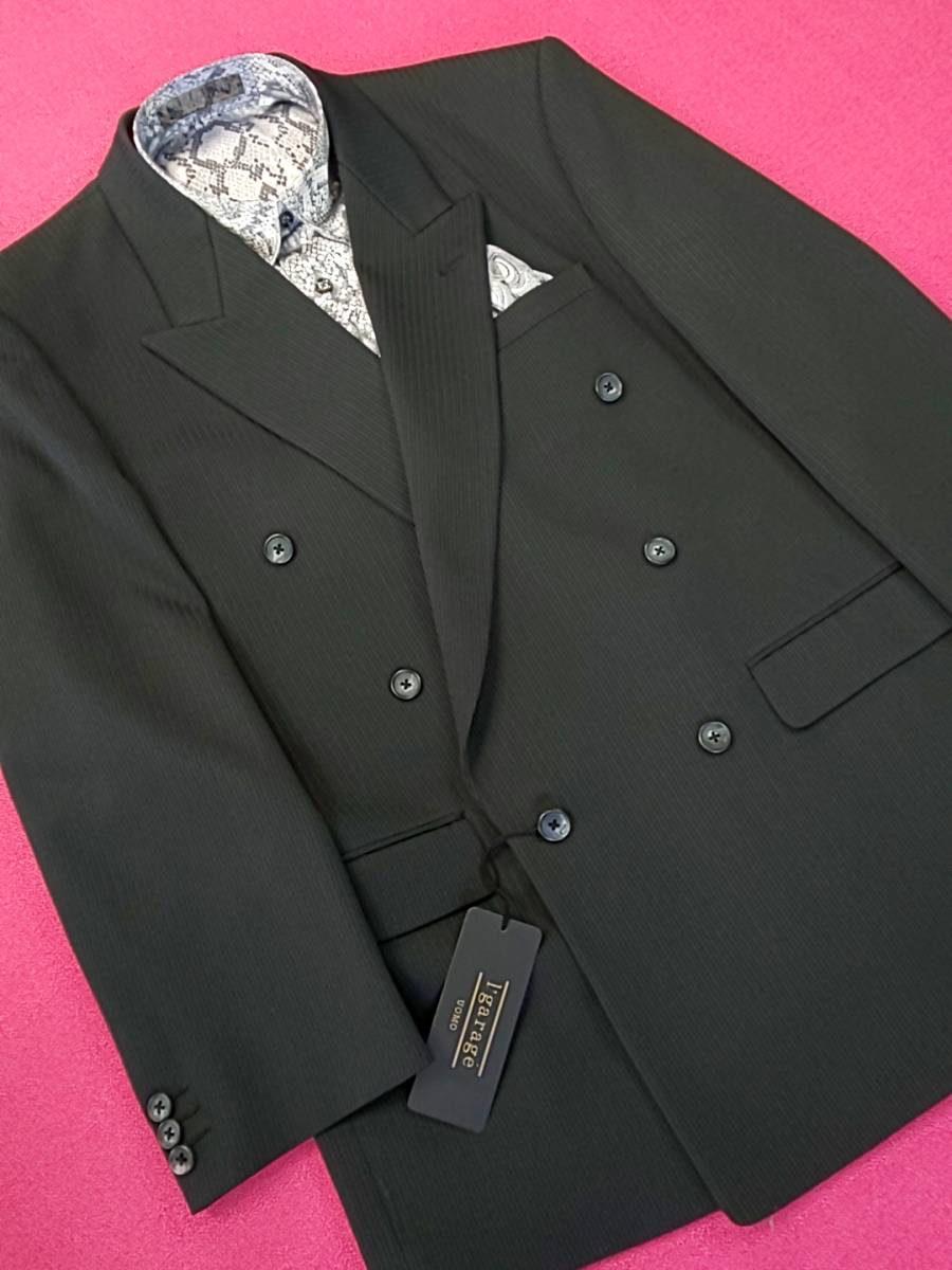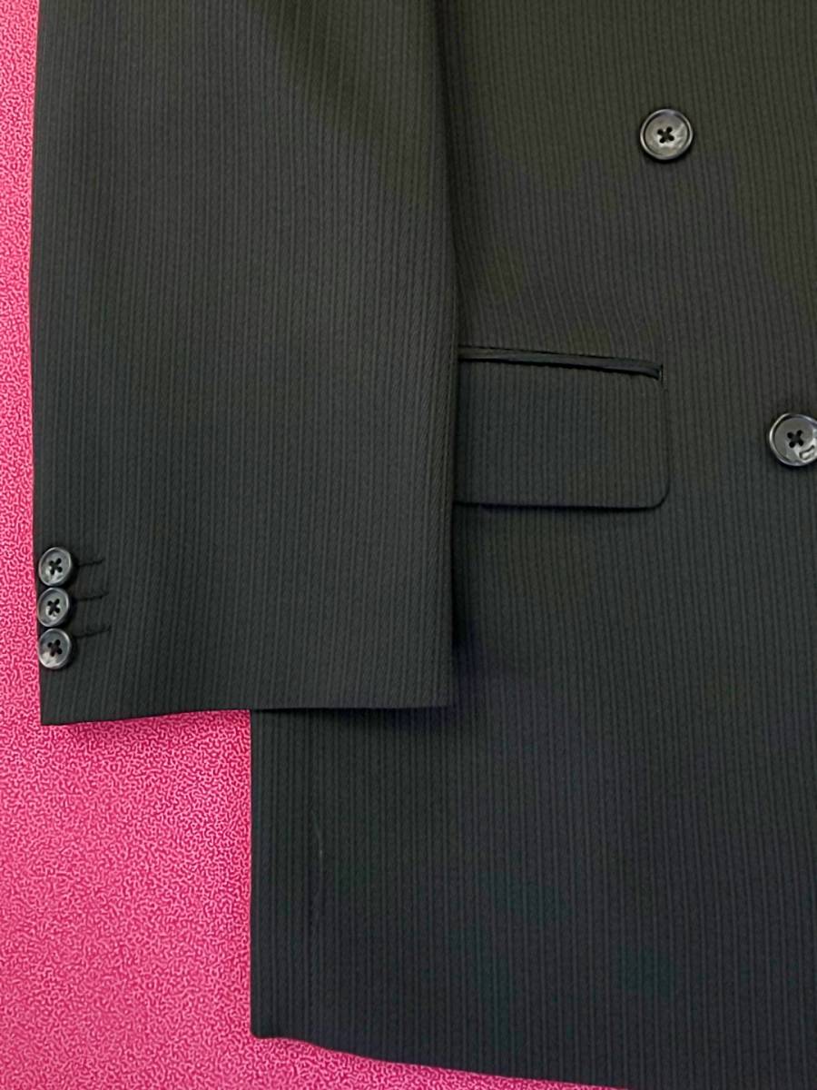 特徴     光沢ある生地でオシャレなストライプ柄ジャガード織りのWスーツです。