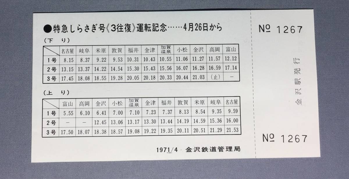 特急「しらさぎ」増発〈3往復〉運転記念入場券 1971年 【K4-33】