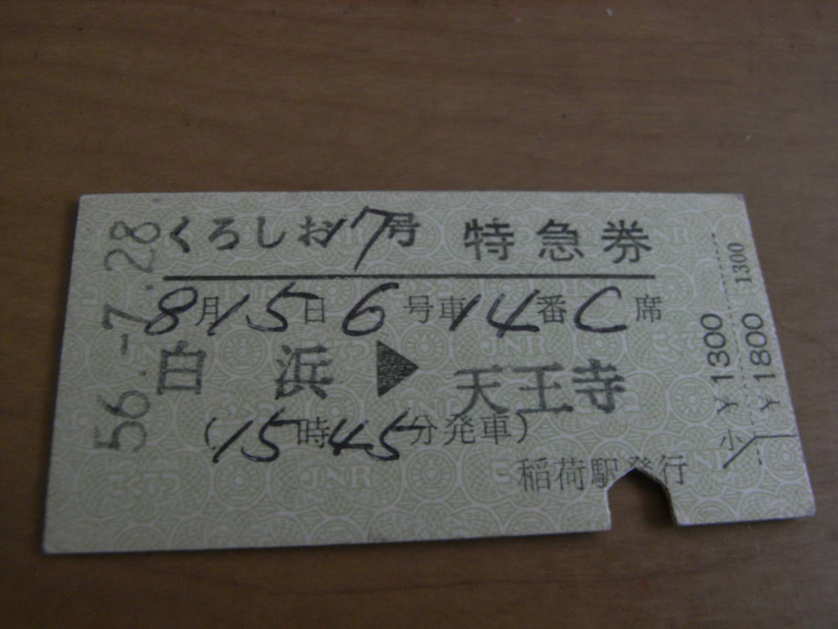 くろしお7号 特急券 白浜→天王寺 昭和56年7月28日発行 稲荷駅発行