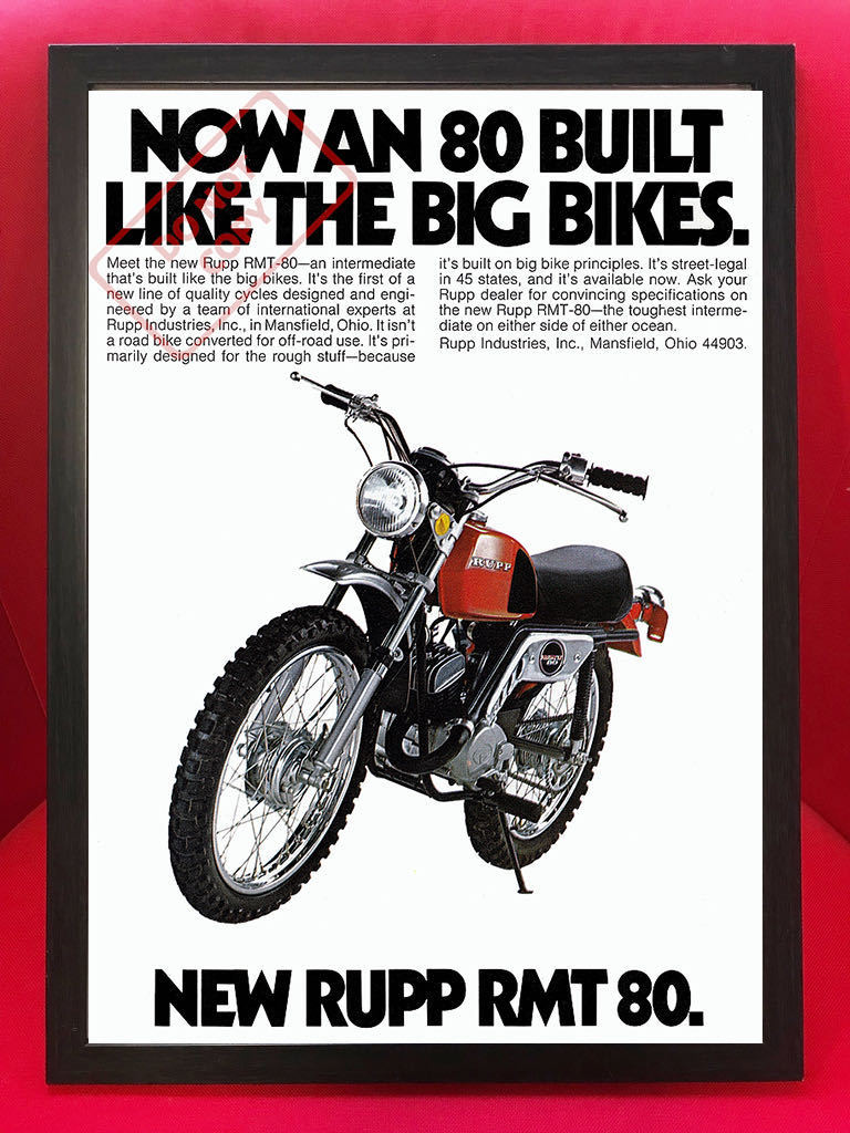 | 1972 Rupp RMT 80 "Now An 80 Built Like The Big Bikes" USA輸入★限定数量 1978年に倒産したアメリカのラップ・インダストリーが1972年に発表したダートバイク『ラップRMT-80』のレアな広告のポスターレプリカです。 ポスターサイズ:42cm × 29.7cm (ポスターのみの出品で額は付属しません。額はA3サイズ用がピッタリです) こちらのポスターは高品質で厚みのあるアートペーパーにプリントされた非常にクオリティの高いポスターです。カラーコピーやクラフト紙や布にプリントされたような画質の粗いポスターではありません。また、存在感があり、しかも飾るのにも困らない絶妙なサイズですので、お好みのフレームに入れディスプレイするのに最適です。またしっかりとした厚みのあるポスターですので、そのまま無造作に壁などにピンでとめるディスプレイのスタイルもおススメです。趣味の部屋・ガレージ・カフェ・ショップ・Bar・オフィスなどに! ※60's・70's・80'sを中心にマニアックな映画・旧車・バイク・音楽バンド関連などの様々なポスターを多数出品中ですのでチェックしてみてください! Click→映画関係ポスター Click→音楽関係ポスター Click→自動車関連ポスターA Click→自動車関連ポスターB Click→オートバイ関連ポスター Click→その他ポスター | ||