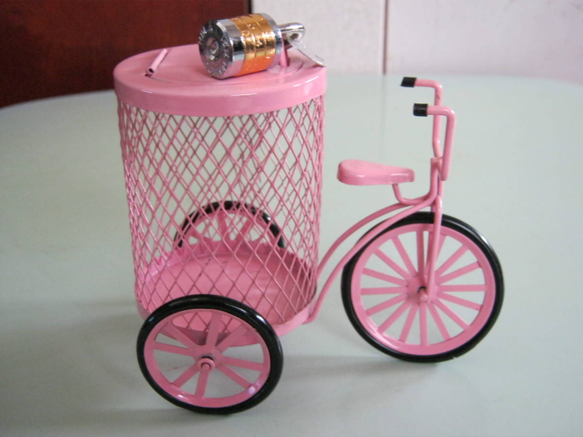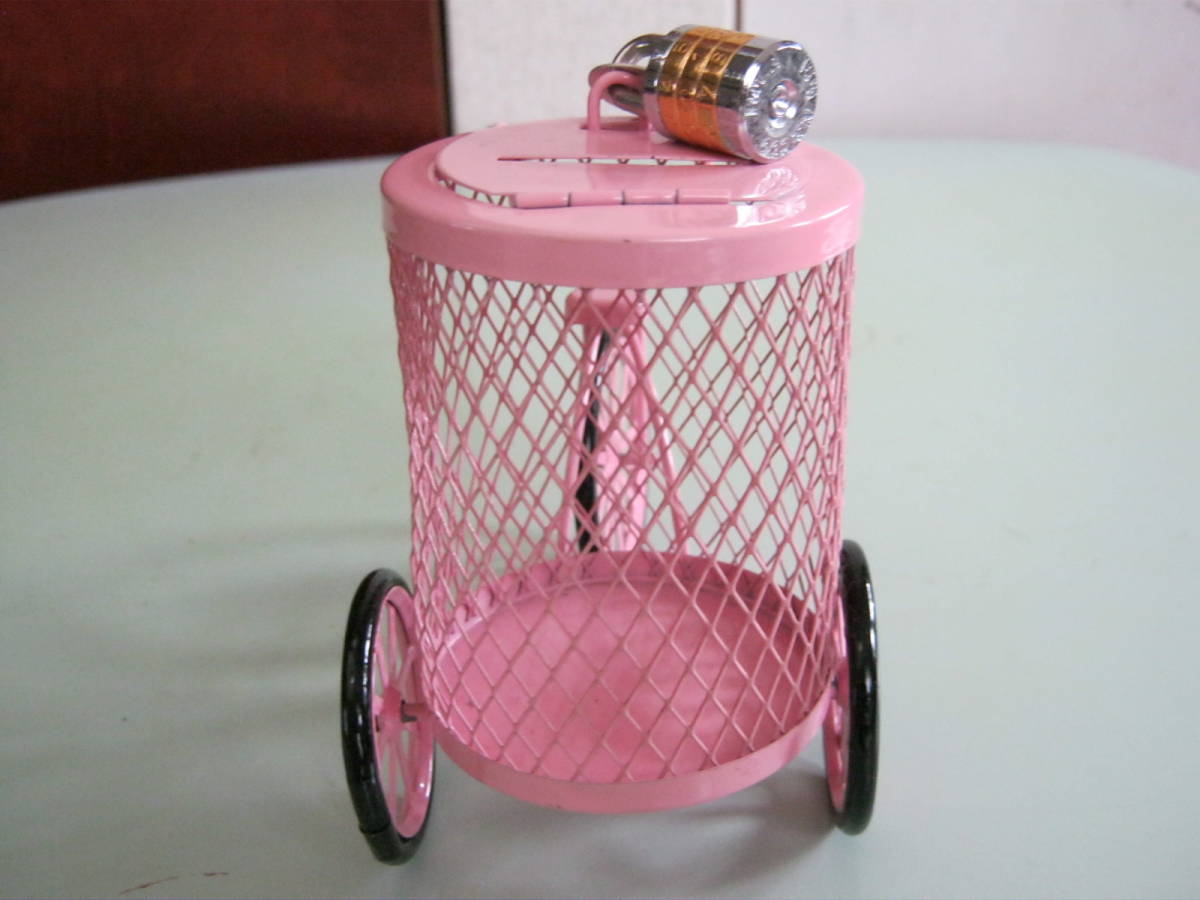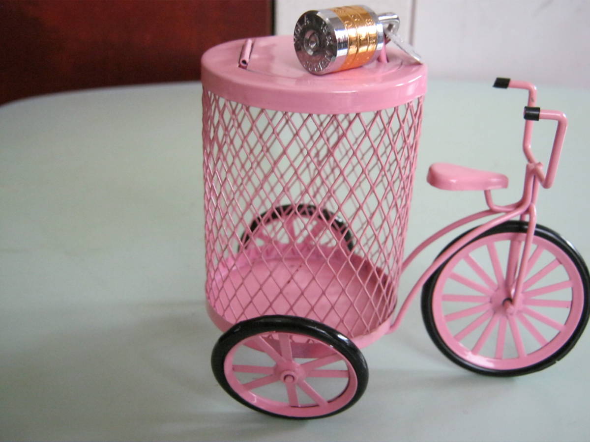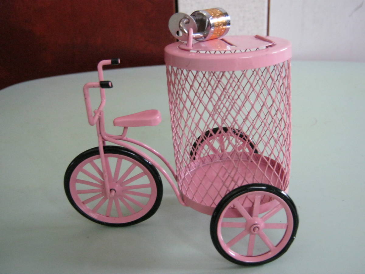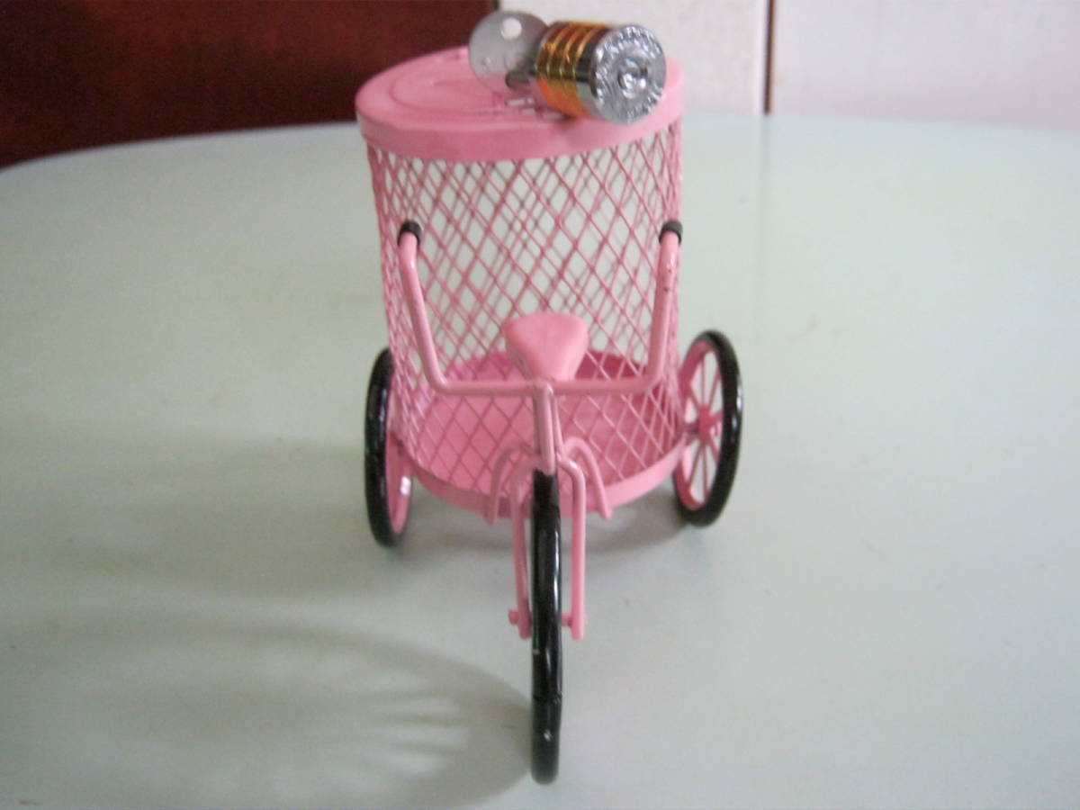 【ピンク色の三輪自転車の後に円筒形のかごがついた貯金箱(ダイヤル式の南京錠付き)】