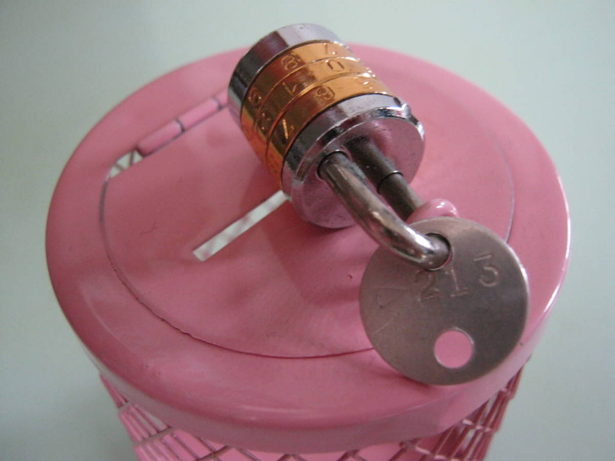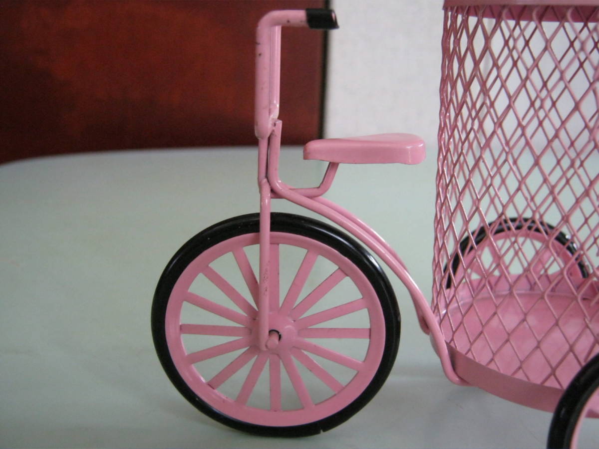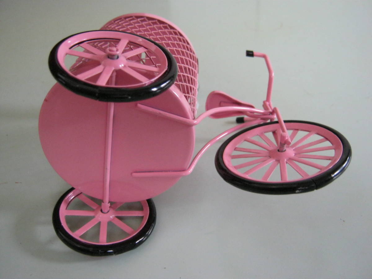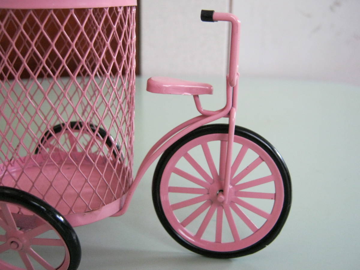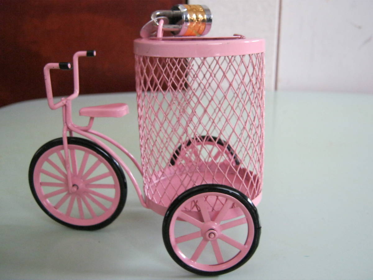 【ピンク色の三輪自転車の後に円筒形のかごがついた貯金箱(ダイヤル式の南京錠付き)】
