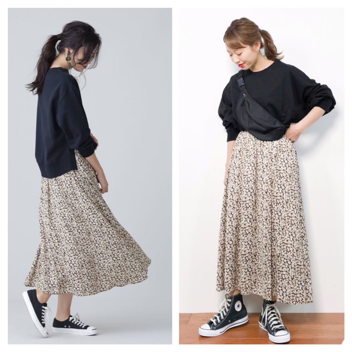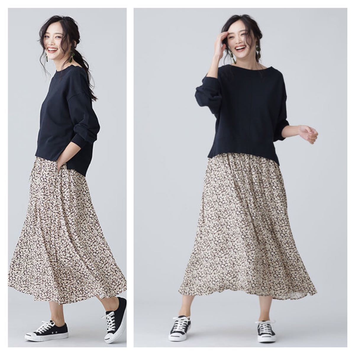 風になびく軽やかなマテリアルが女性らしさを演出。主張しすぎない落ち着いたカラーリングが大人びた表情のプリントスカートはスウェットではずしたカジュアルな着こなしからとろみブラウスを合わせたきれいめスタイルまで幅広く活躍。