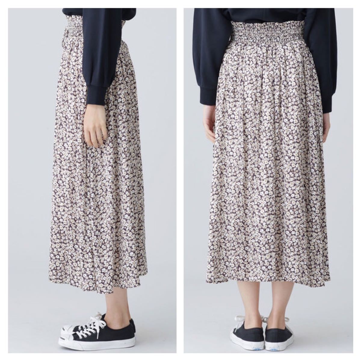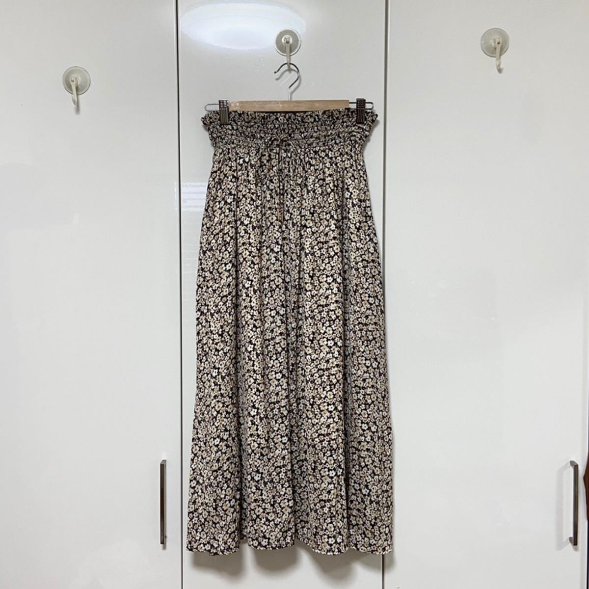 ポリ素材で軽快に仕上げた小花柄のロングスカート。
