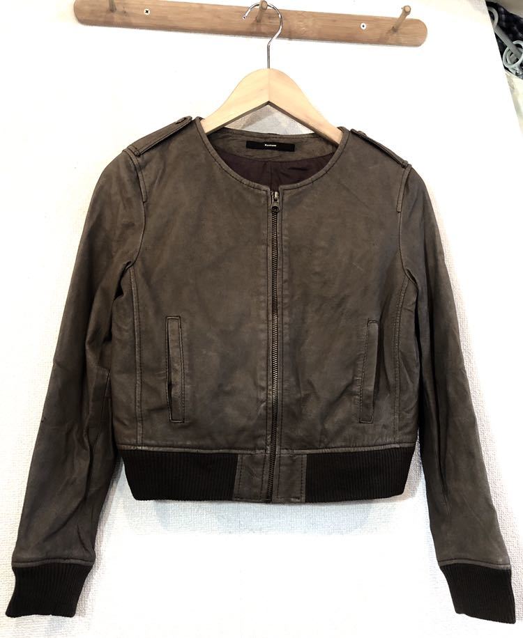 すべて本革でできたモカブラウンカラーのレザージャケットでラインの綺麗なデザインになっています★