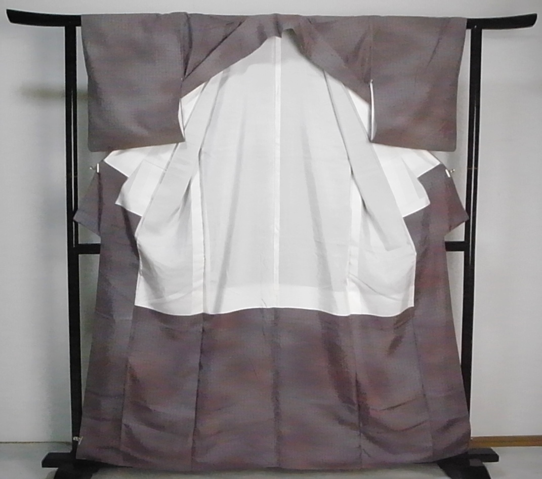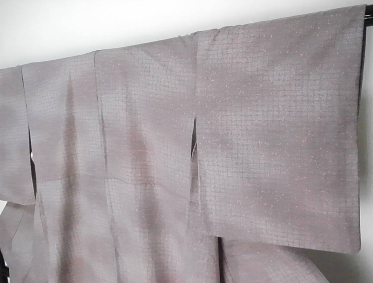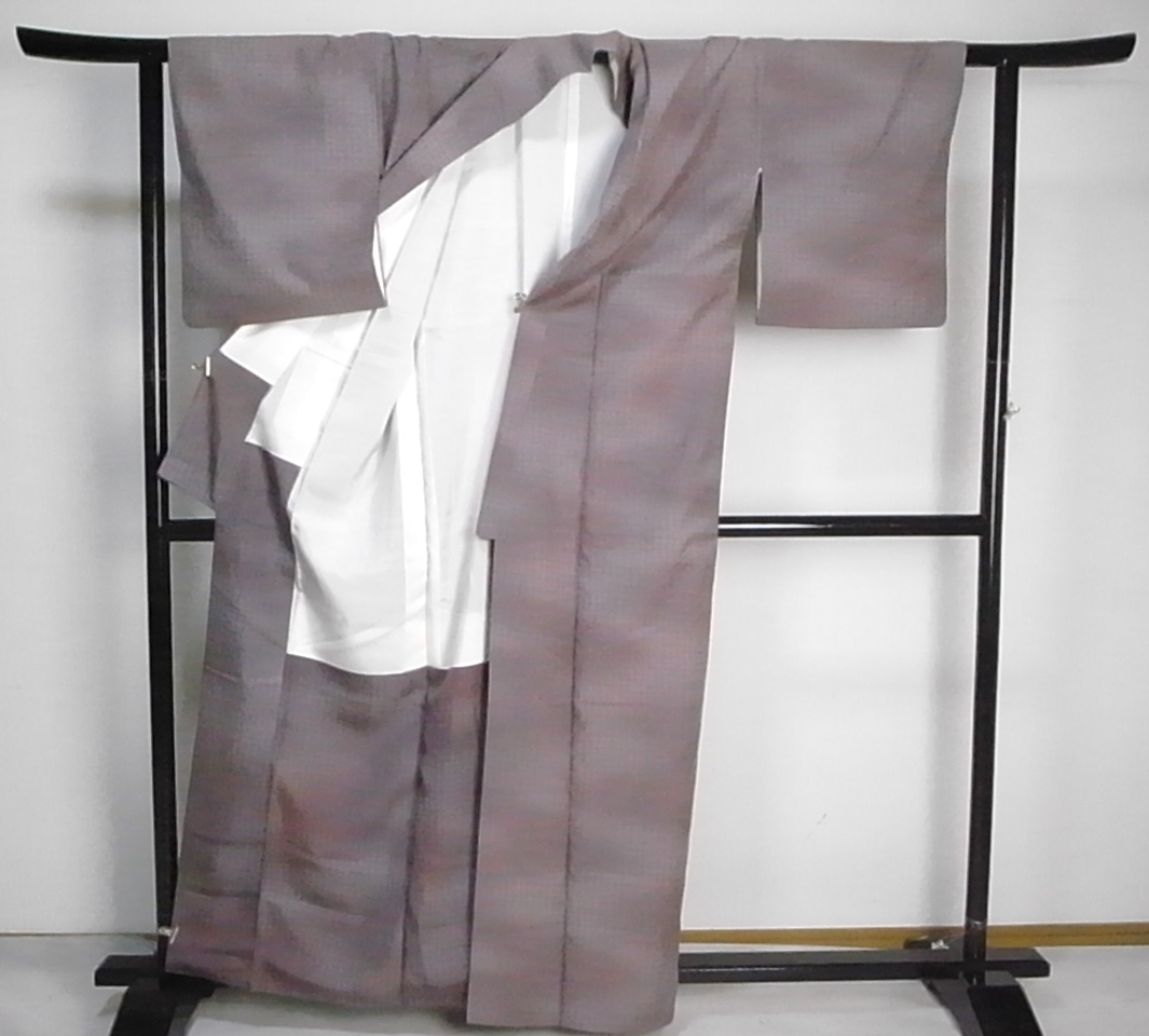 【着物のちさと屋】C174 着物・長着 袷 美品 Lサイズ 正絹紬風織物 薄小豆色・市松風タタキ調柄模様