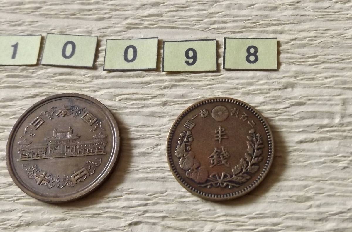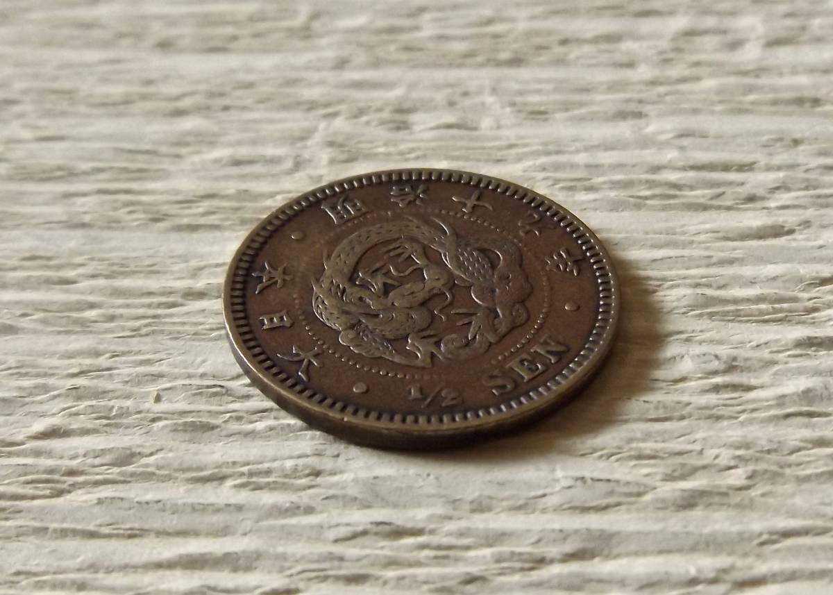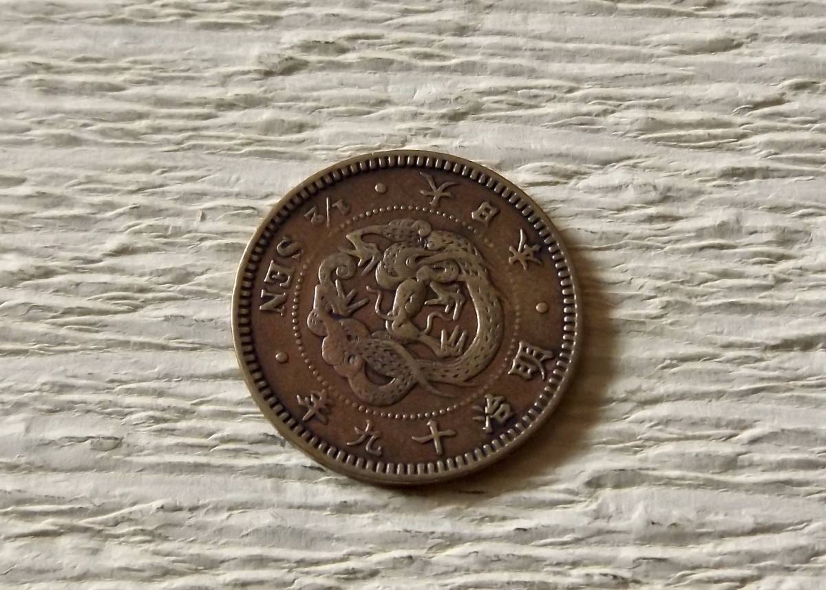 商品名:                半銭銅貨  明治19年    ( 10円硬貨は大きさ確認用で商品ではありません。)
