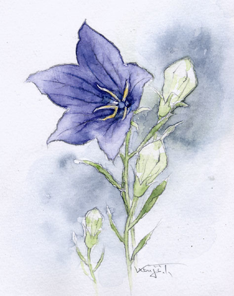 青紫色の星型の花弁が可愛らしい「桔梗」 秋の七草に数えられる 日当たりの良い草原を好むが 野生のものは激減してめったに見ることはなくなった 桔梗は広い庭よりも 小さな庭の石囲いの中のほうが似合うような気がする (絵・文 / 田中 健二 昭和8年生まれ)