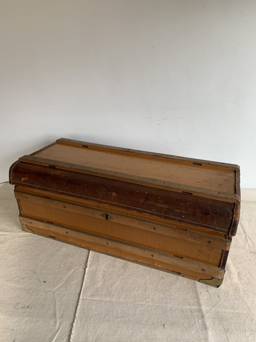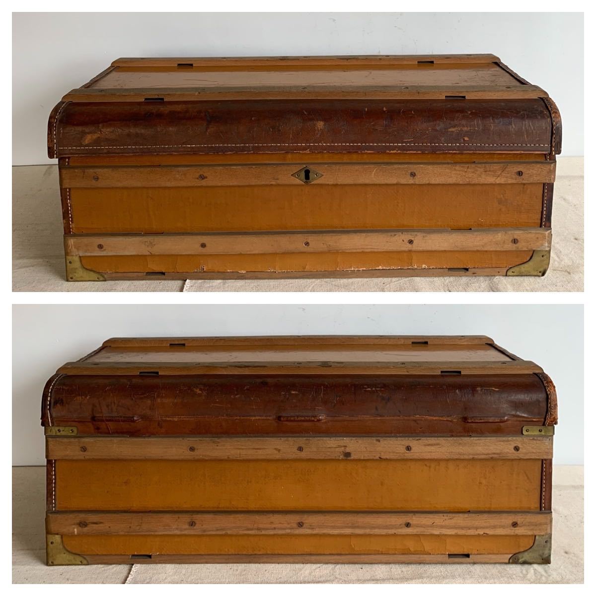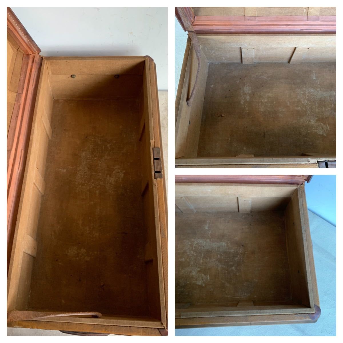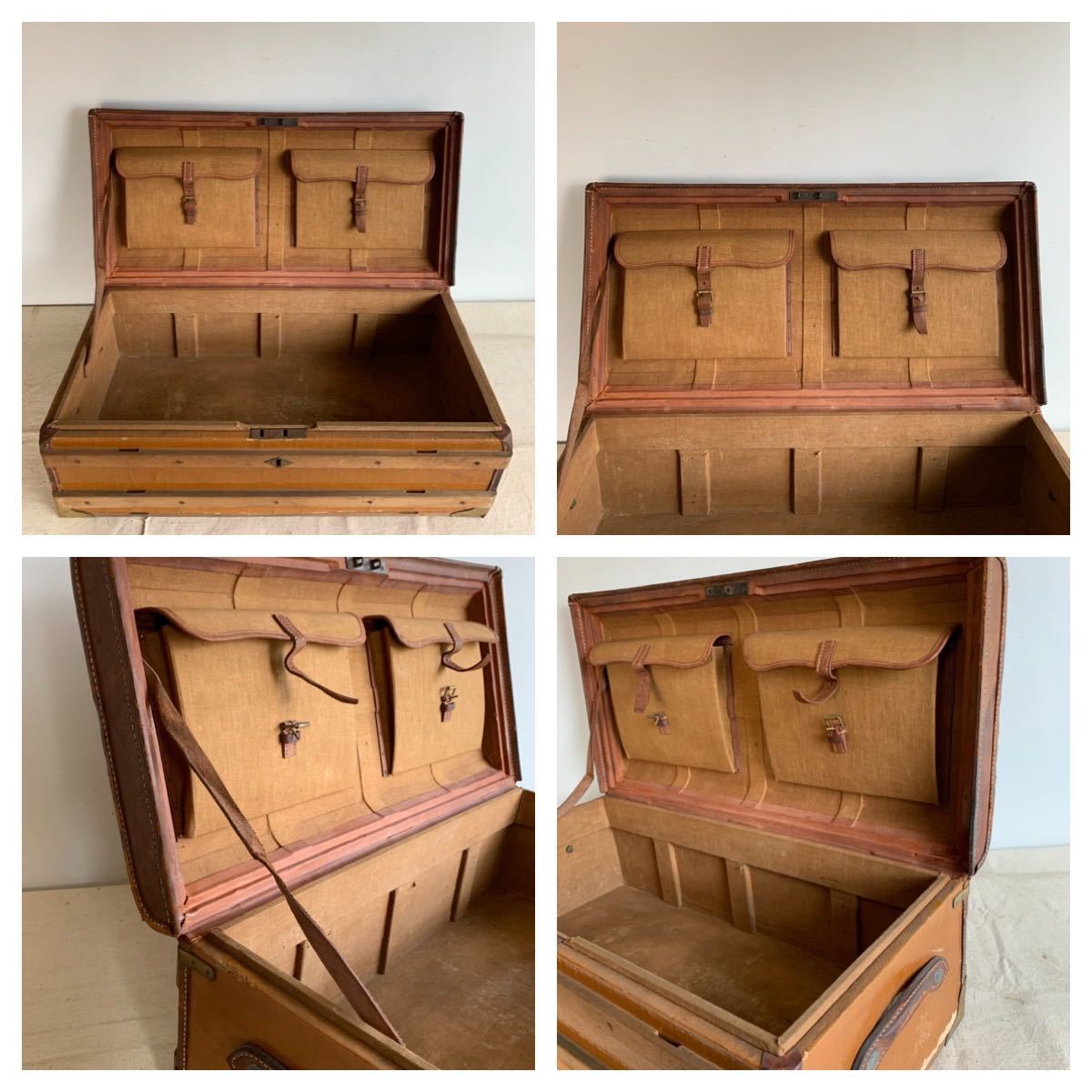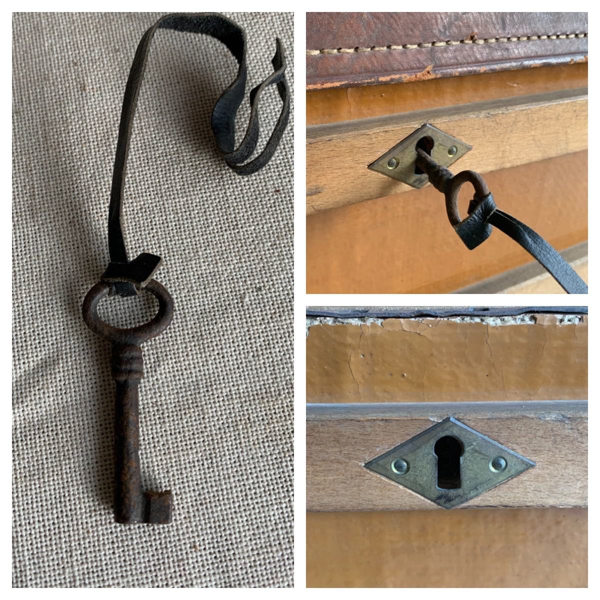 鍵付きの大き目の古いトランクです。真鍮金具、木、皮と色々な素材が使われています。しっかりとした作りで、衣類や小物、本などの収納ボックスとして、お部屋のインテリアやお店の什器に使って頂くと素敵だと思います。上にガラス板などを置いてローテーブルとして使っても良さそうです。鍵はありますが、やり方が悪いのかうまくかかりません。