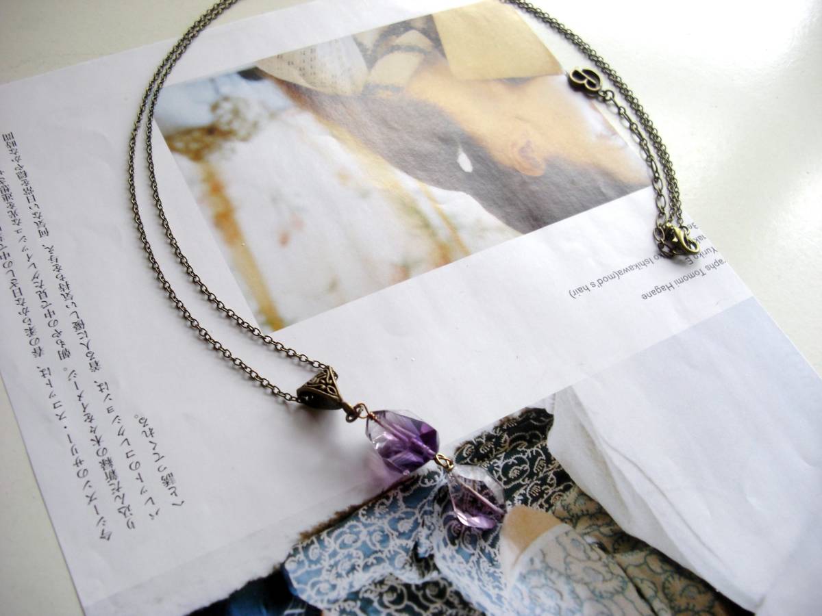 お気に入りを集めて・・シリーズです♪パールとアメジスト・・神秘的なアメジストのネックレスです♪透明度の高いラフ・カットのアメジストは17ミリ、14ミリの石を2つつなげてシックな座金を合わせました♪長さは77センチ+ア ジャスター10センチで全長87センチ位です♪トップは6・5センチ位です♪お揃いのシリーズも出品しています♪シンプ ルで飽きのこないいつまでも着けられるデザインを考えて作りました!ハンドメイドをご理解頂いてノークレーム、ノーリターンでお願いします