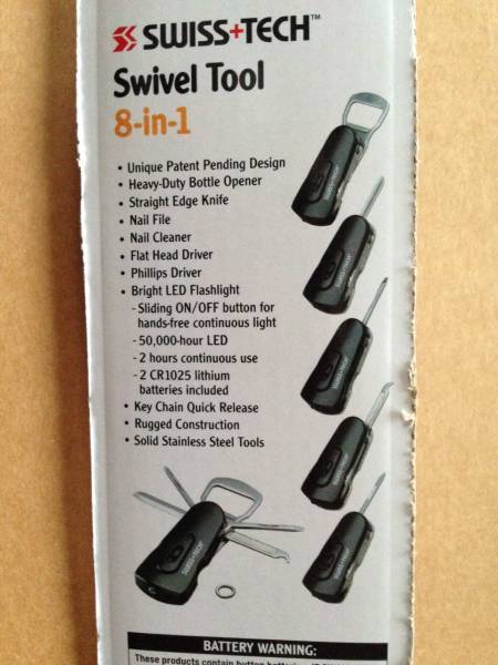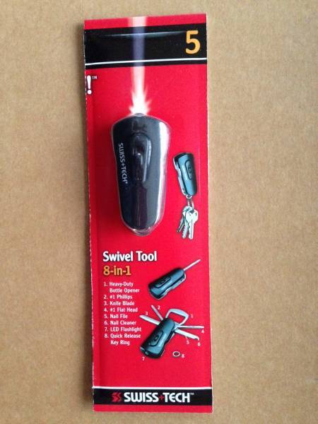 | SWISS+TECH micro-tool Swivel Tool 8-in-1 1. Heavy-Duty Bottle Opener 2. #1 Phillips 3. Knife Blade 4. #1 Flat Head 5. Nail File 6. Nail Cleaner 7. LED Flashlight 8. Quick Release Key Ring LEDライト・爪やすり・ナイフ・キーリングなどのツールセット | |