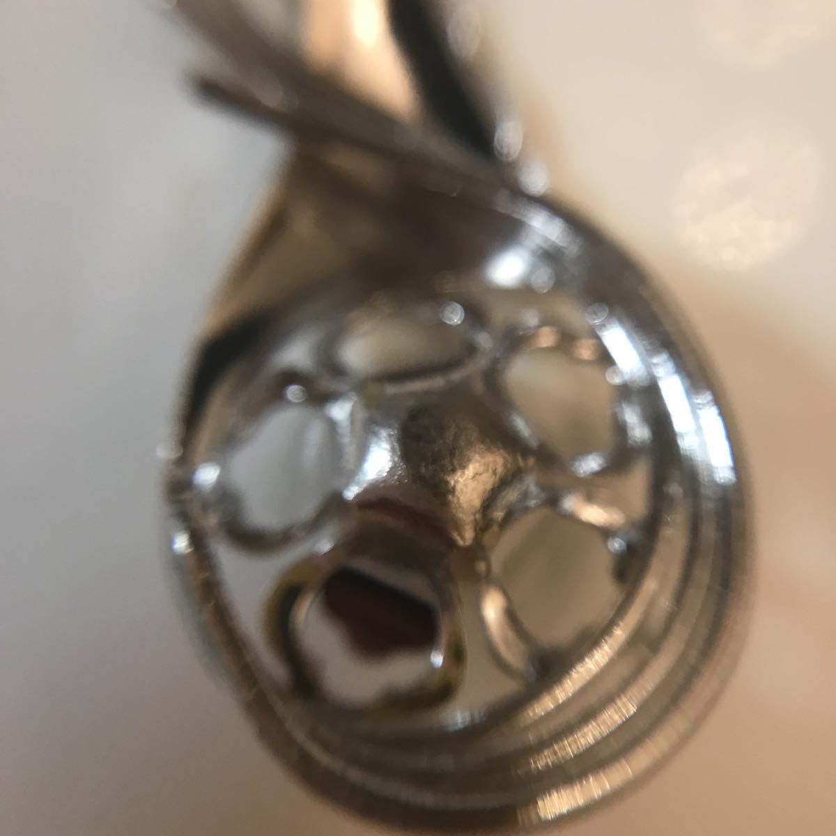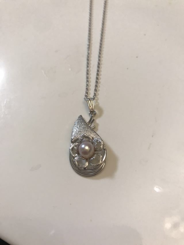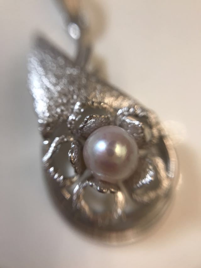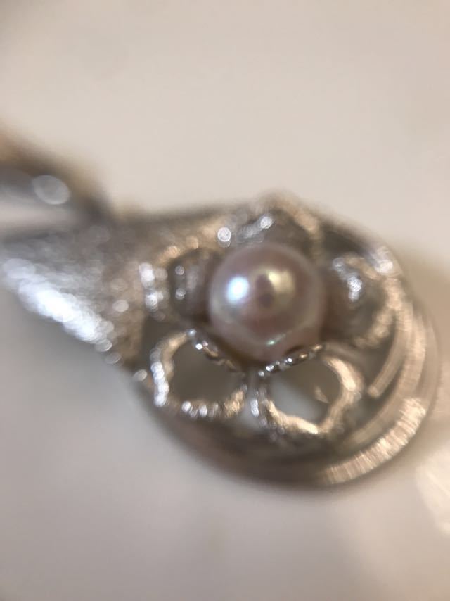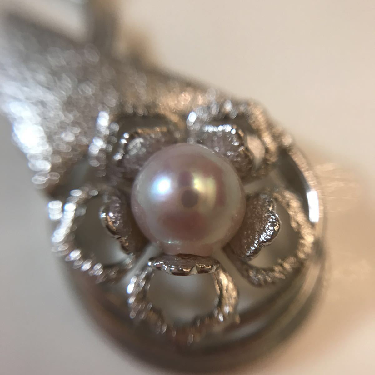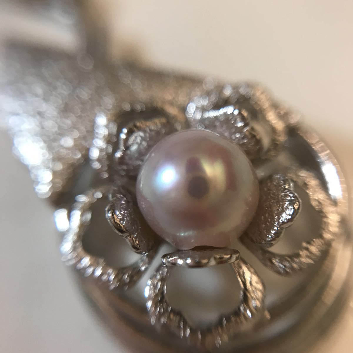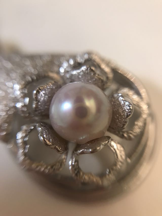 カメラが写り込むほど、照りの良いピンクがかった綺麗な真珠です。