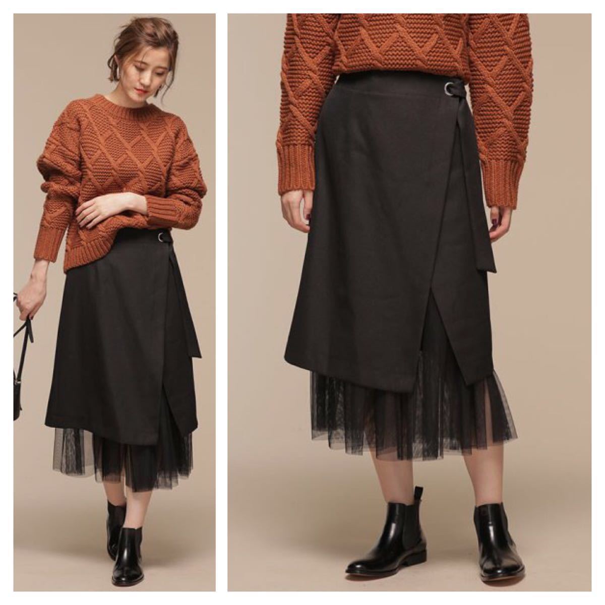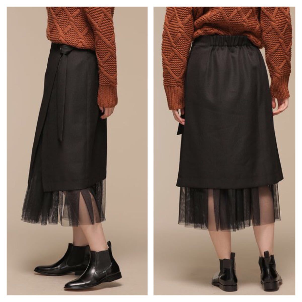 チュールを裾から大胆に覗かせたドラマティックなスカート。長めのベルトがスタイリングのアクセントになりつつ、縦長効果を発揮。