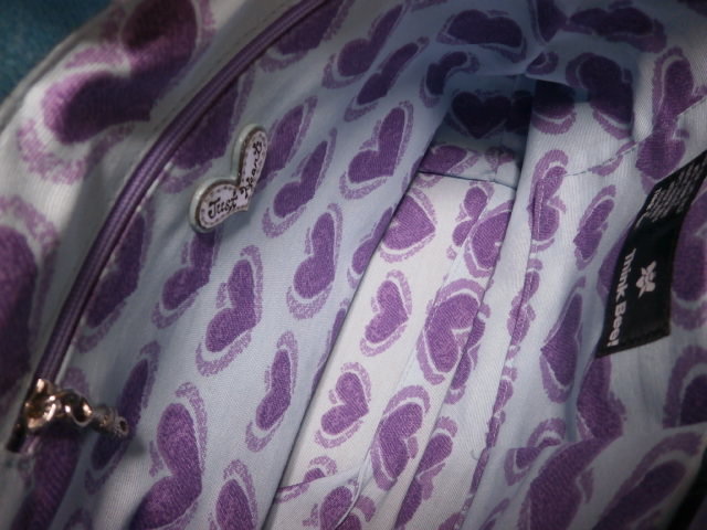 内部にポケット2つ   大きなファスナー付きと入口にマグネットボタン式でチャーム付です。