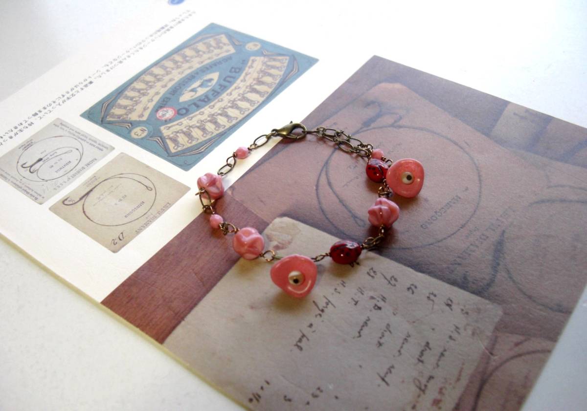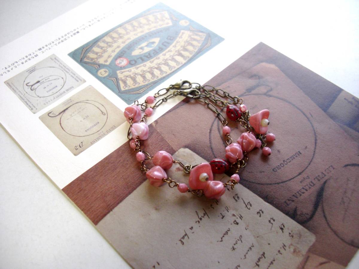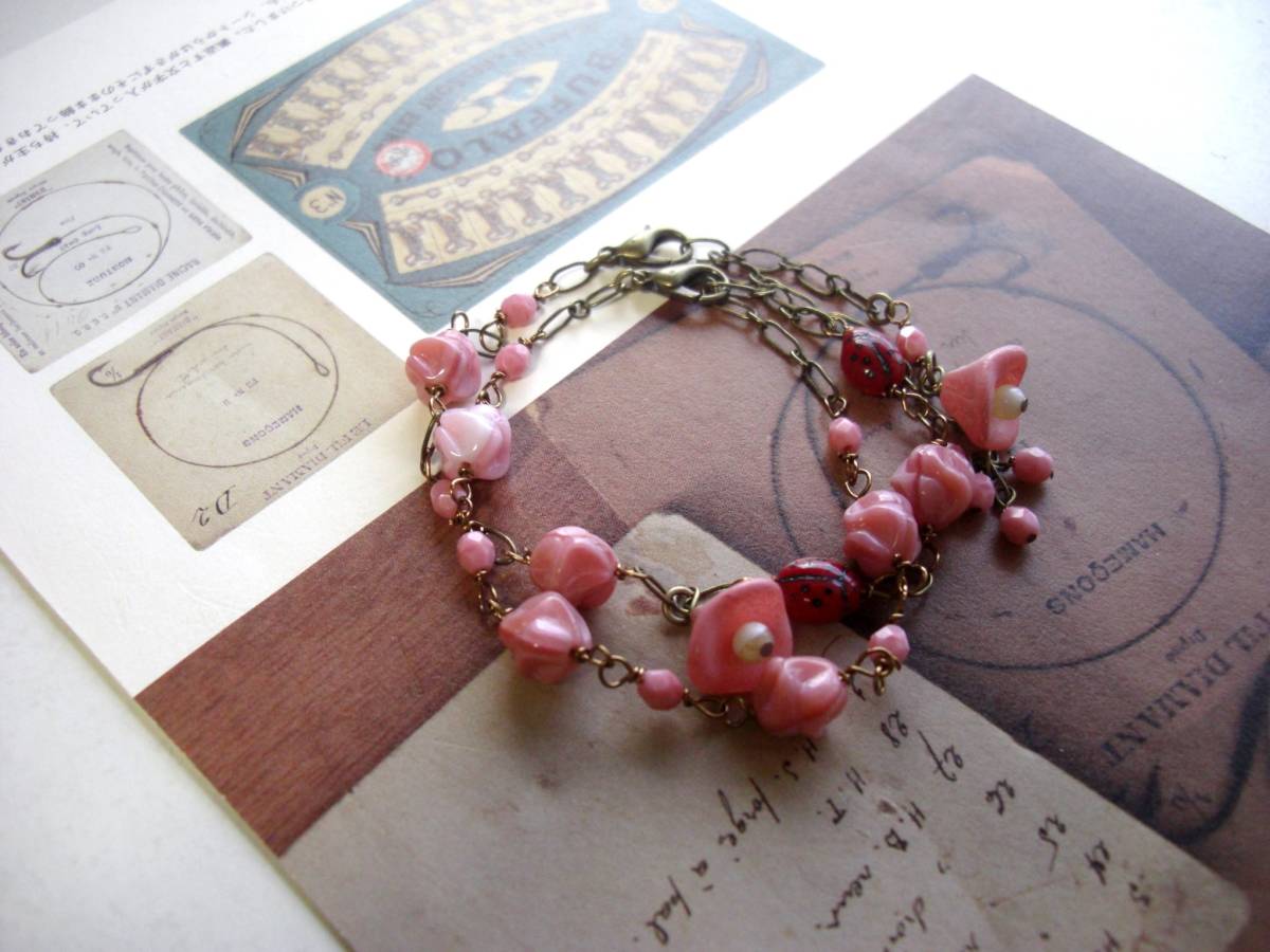 ジゼルのクローゼット・・シリーズです♪甘すぎないピンクを繋いで・・シックなモーヴピンクのチェコビーズのブレスレットです♪デザイン違いの2点セットで す♪同じ色のチェコのお花やてんとう虫のチェコビーズを合わせてロマンチックな表情です♪チェコビーズは4ミリから9ミリ位、てんとう虫は7×9ミリ位で す♪お花の方のブレスレットの長さは全長23センチ位で調節自由です♪右側のブレスレットの長さは全長22センチ位で調節自由です ♪お揃いのネックレスも出品しています♪シンプルで 飽きのこないいつまでも着けられるデザインを考えて作りました!ハンドメイドをご理解頂いてノークレーム、ノーリターンでお願いします