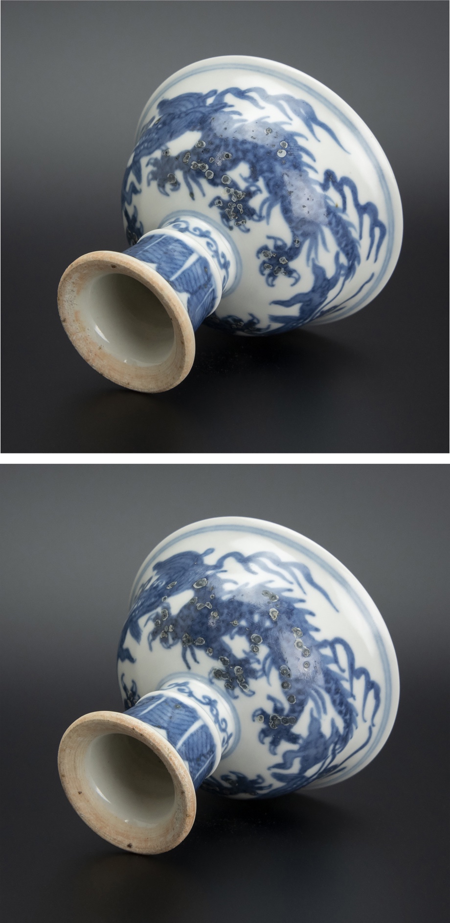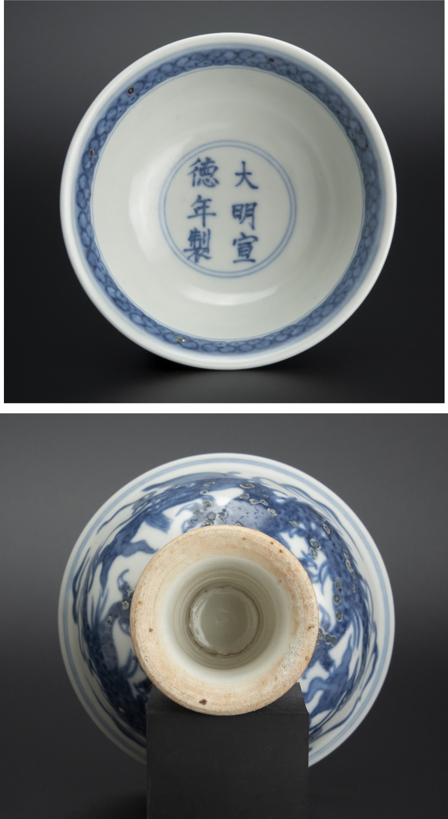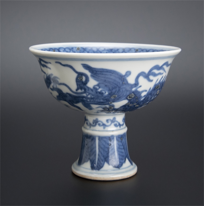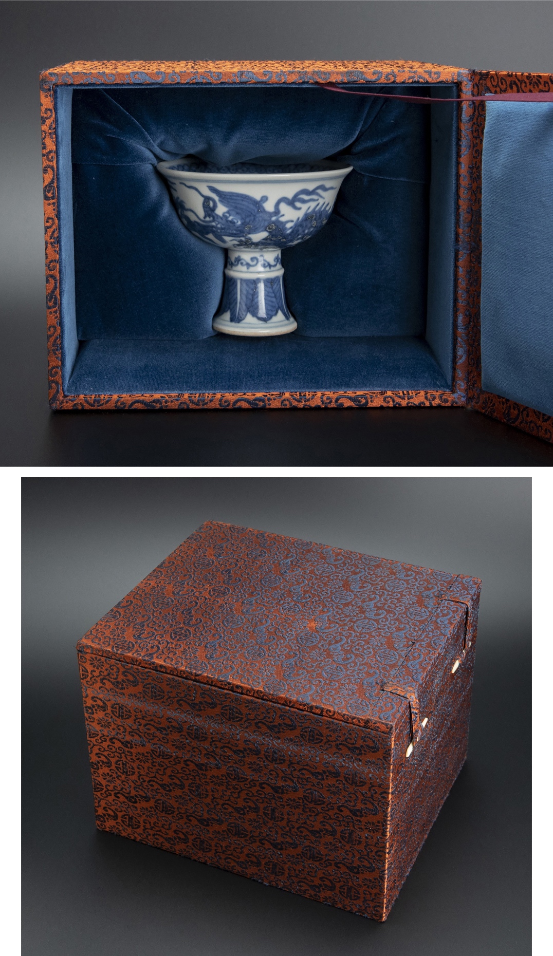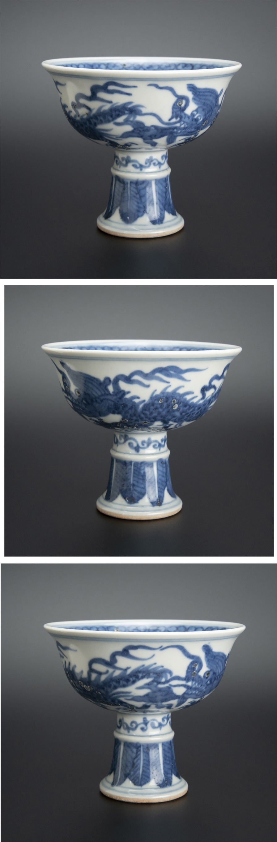 清 青花云龍紋高足碗 大明宣徳年制款 共箱