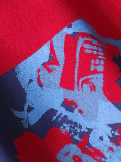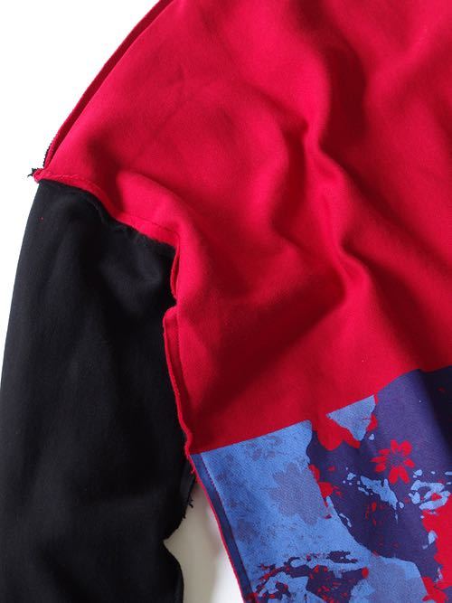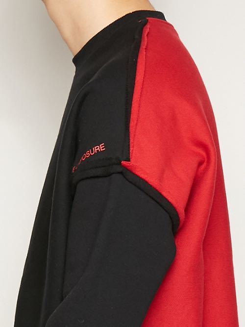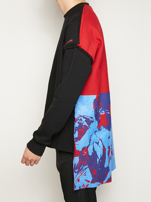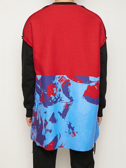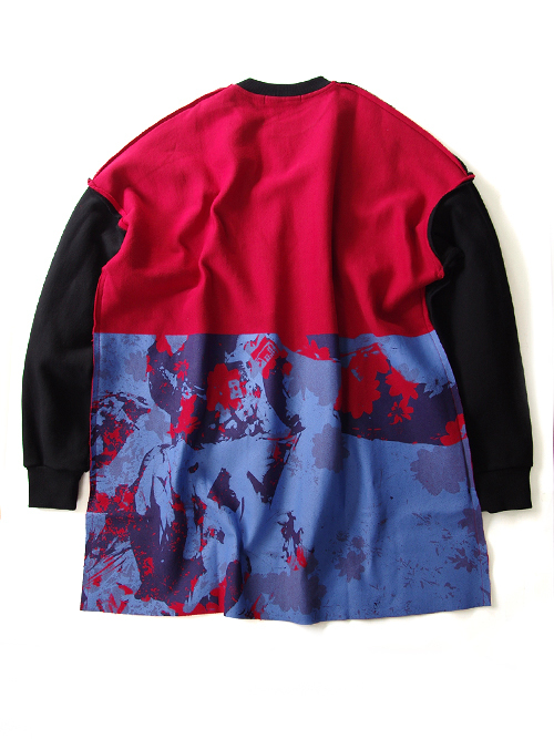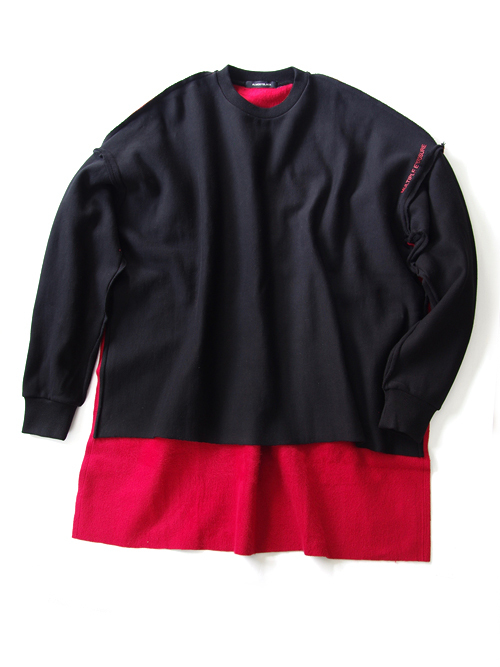 フロントを黒、バックを赤の生地で切り替え、裾に大きく着丈の差をつけたスウェット。バックシルエットの腰から裾にかけて「多重露光」をイメージした抽象的なグラフィックがプリントされ、大胆なデザインに仕上がっている。
